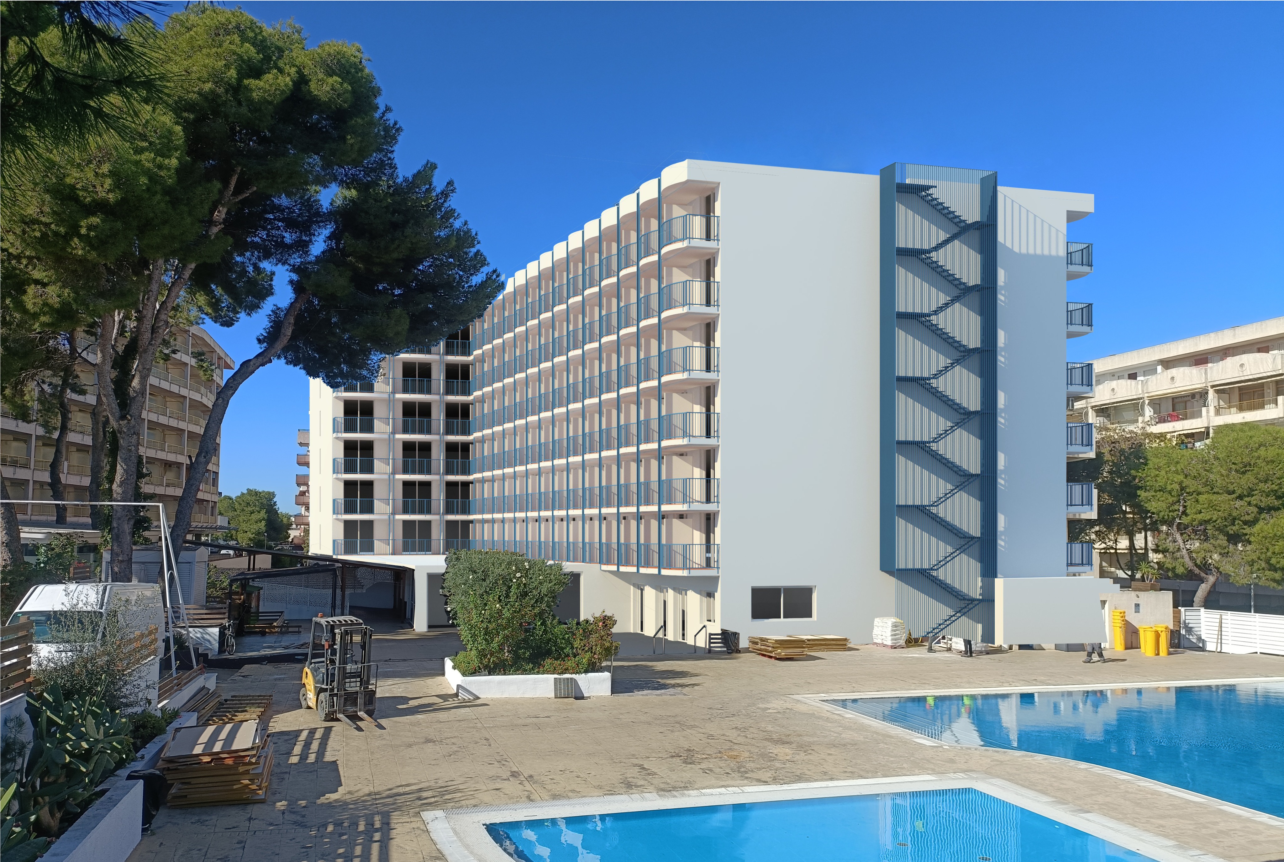 add some life in the balconies and in the windows keep blue color in railings