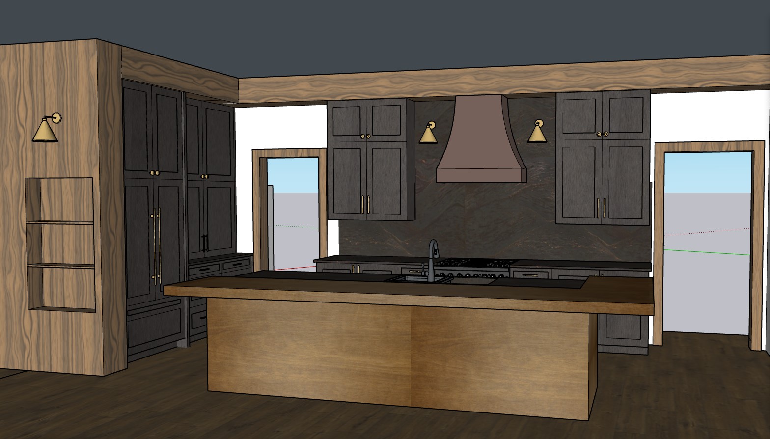 photorealistic render of a custom kitchen interior maintain original design and colors exactly do not alter color palette perimeter cabinetry is dark stained wood almost black with visible natural wood grain trough the dark color and a soft satin finish not painted not flat cabinet hardware is brushed brass handles and knobs kitchen island is a warm medium caramel stained wood with visible grain and a satin finish island and perimeter countertops match exactly in material and color range hood is brushed antique copper with a soft aged patina not polished not shiny wall sconces on either side of the hood are brass with a warm brushed finish lighting is warm 2700k 3000k a continuous wood soffit architectural band runs along the top of the cabinetry in an antique wood tone with subtle aging the faucet is matte black in the island doorways are pocket doors with trim that matches the surrounding wood tones use realistic natural lighting soft shadows and accurate material reflections emphasize wood grain texture and depth and subtle metal reflectivity avoid overexposure avoid high gloss finishes and do not change or reinterpret any colors there are no seams in the island and the doors are pocket doors remove the handles on the pockets doors