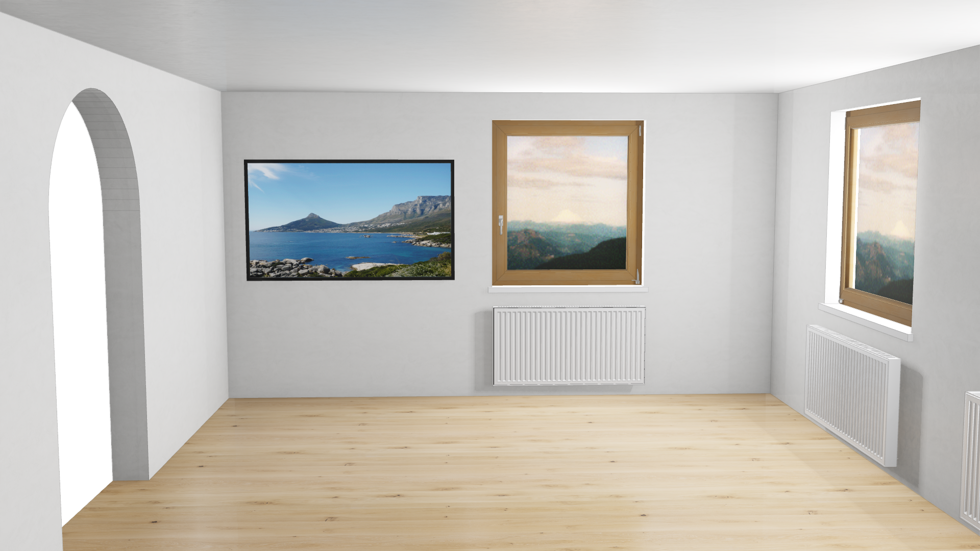 design a built in modern tv and living wall in a minimalist style style colors light warm wood natural oak look matte finish combined with soft earth tones sand warm beige taupe clean lines handleless fronts simple and calm design important architectural elements there is a window and a radiator on the wall the living wall must fully frame and integrate the window the radiator must be concealed with ventilated wooden slats air must circulate do not block the window glass keep it fully functional and accessible the built in furniture must extend to the wall opening doorway on the left side do not block doors or walking paths maintain clear circulation space furniture composition low cabinets at floor level with closed push to open fronts tv integrated flush into the design tall glass display cabinets tinted or fluted glass slim black or bronze metal frame floating wooden shelves mounted on the wall balanced mix of open and closed storage lighting warm indirect led lighting 2700 3000k lighting inside vitrines and under shelves overall look warm calm architectural functional and minimal everything should look like one seamless custom built unit that respects windows doors and room circulation