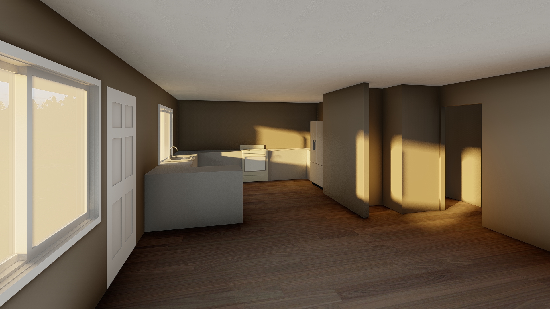 i want the kitchen to be in a farmhouse modern with white shaker cabinets and a marble counter top the nook will house a beverage or wine area add better lighting for the interior rendering and add pendant lights over the peninsula add a wall art as needed