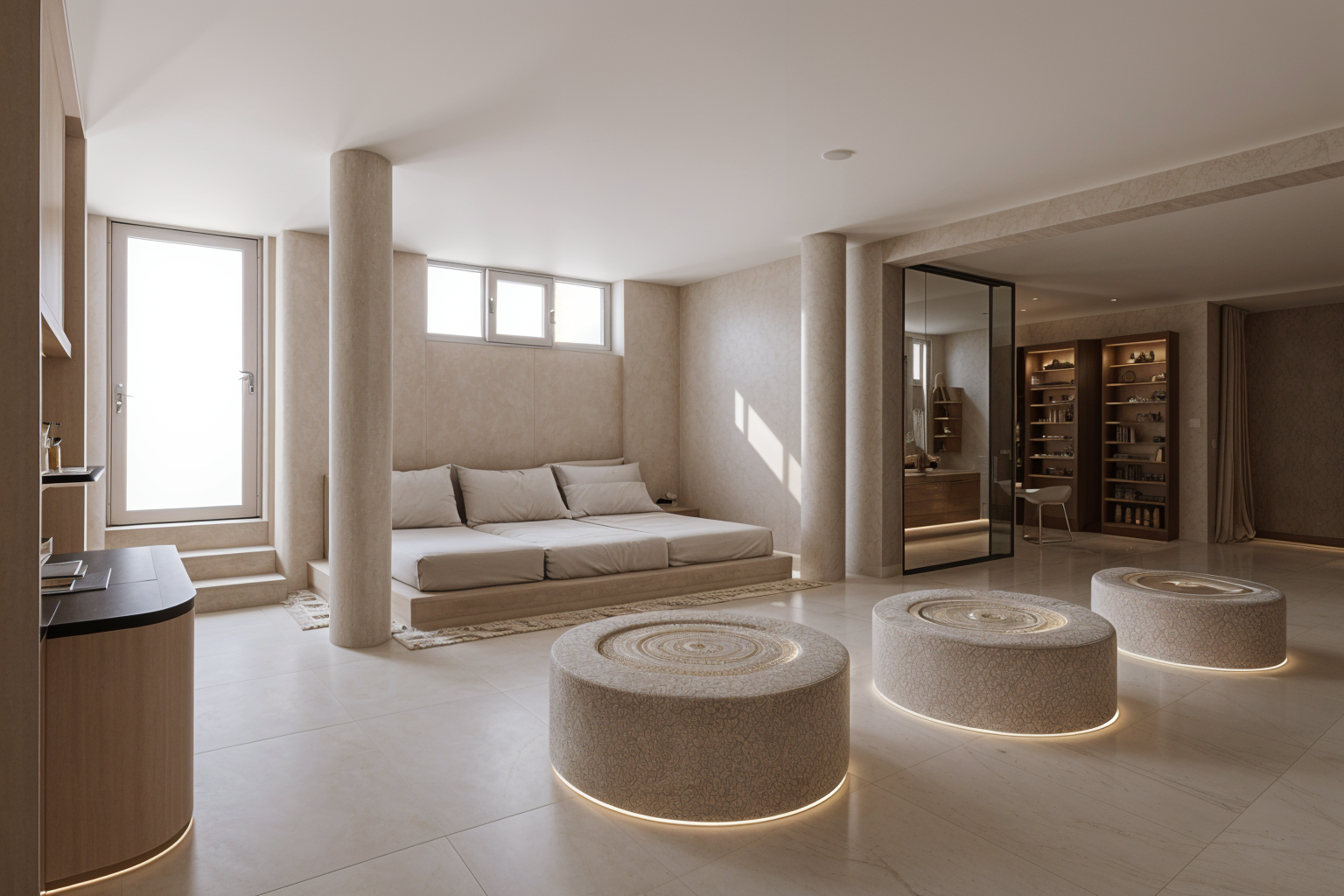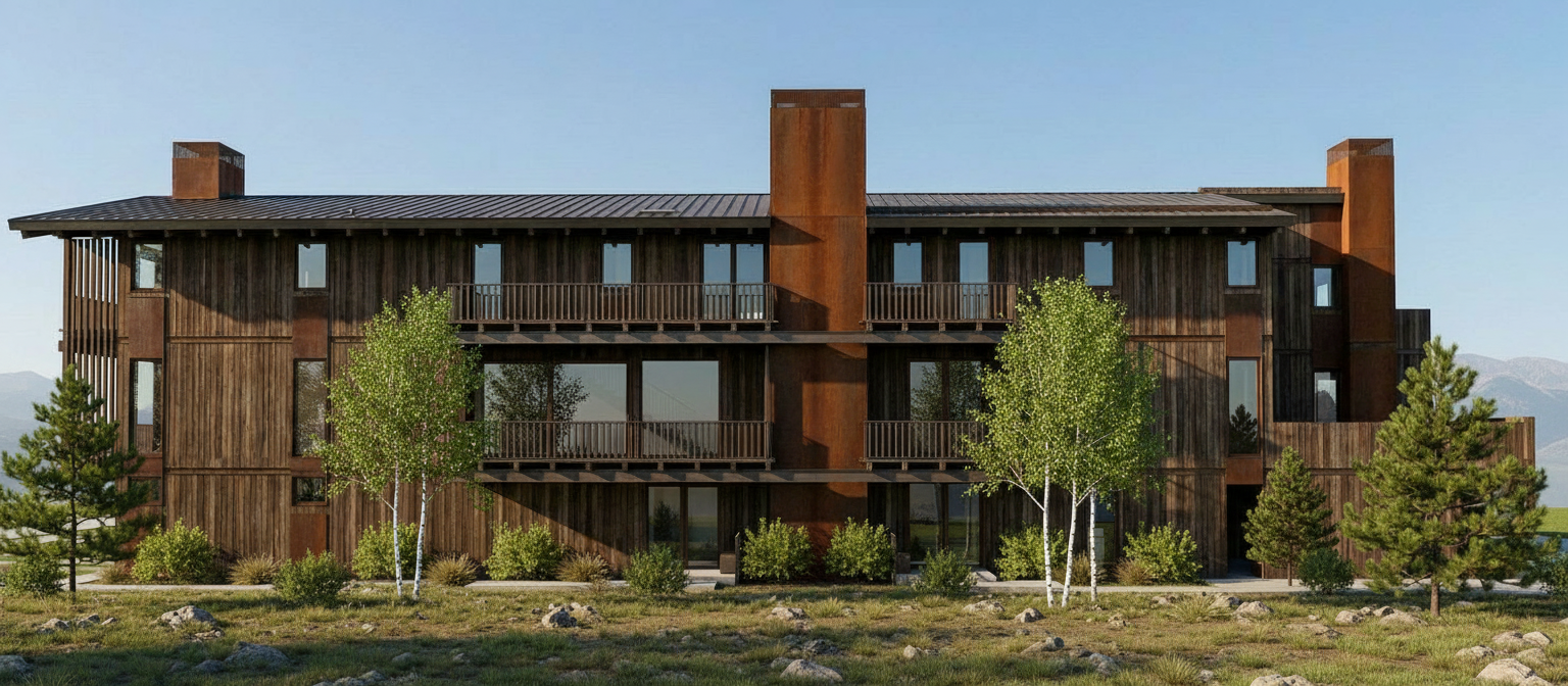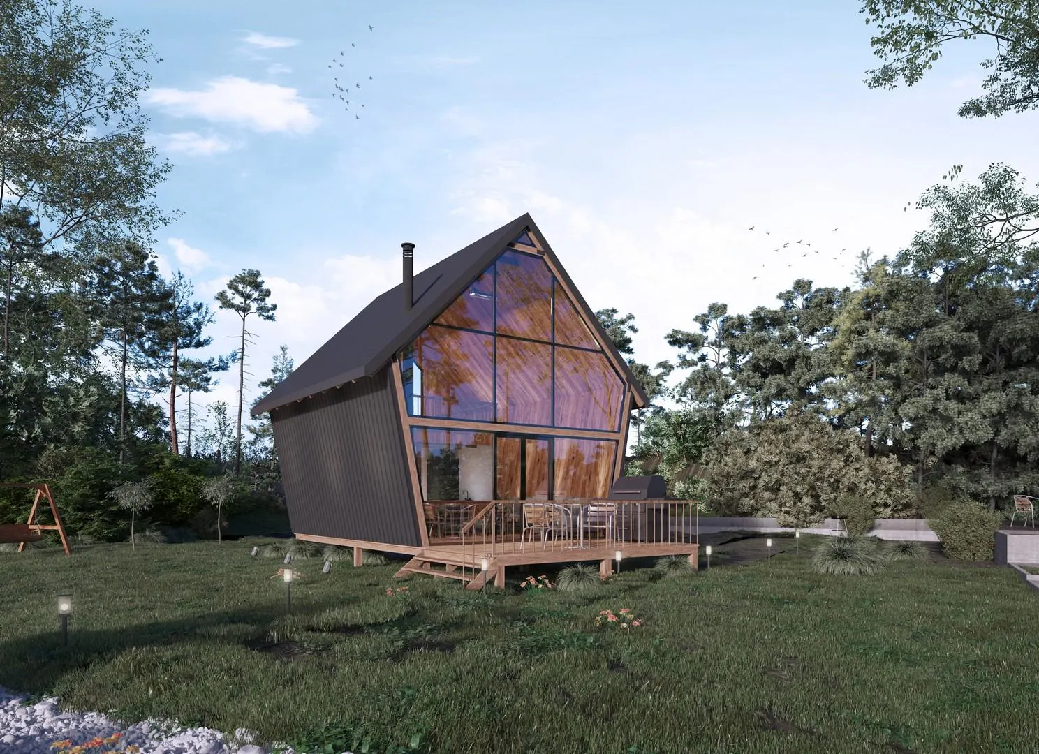 make a photorealistic rendering of the house add people in the front and apply a moody filter and increase density of trees in background