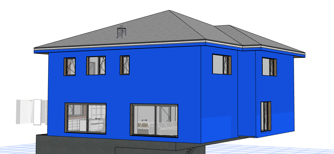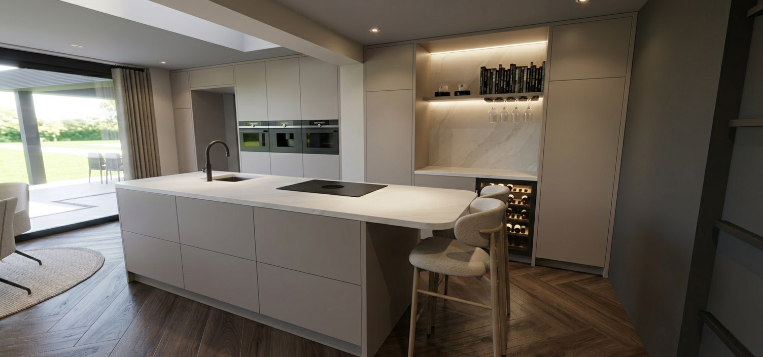 rear facade of a two storey classical family house large covered garden veranda with barbecue and outdoor seating area big sliding glass doors from living room pitched roof with anthracite roof tiles light plaster facade dark window frames landscaped garden with lawn and trees elegant residential architecture photorealistic render soft daylight ultra realistic