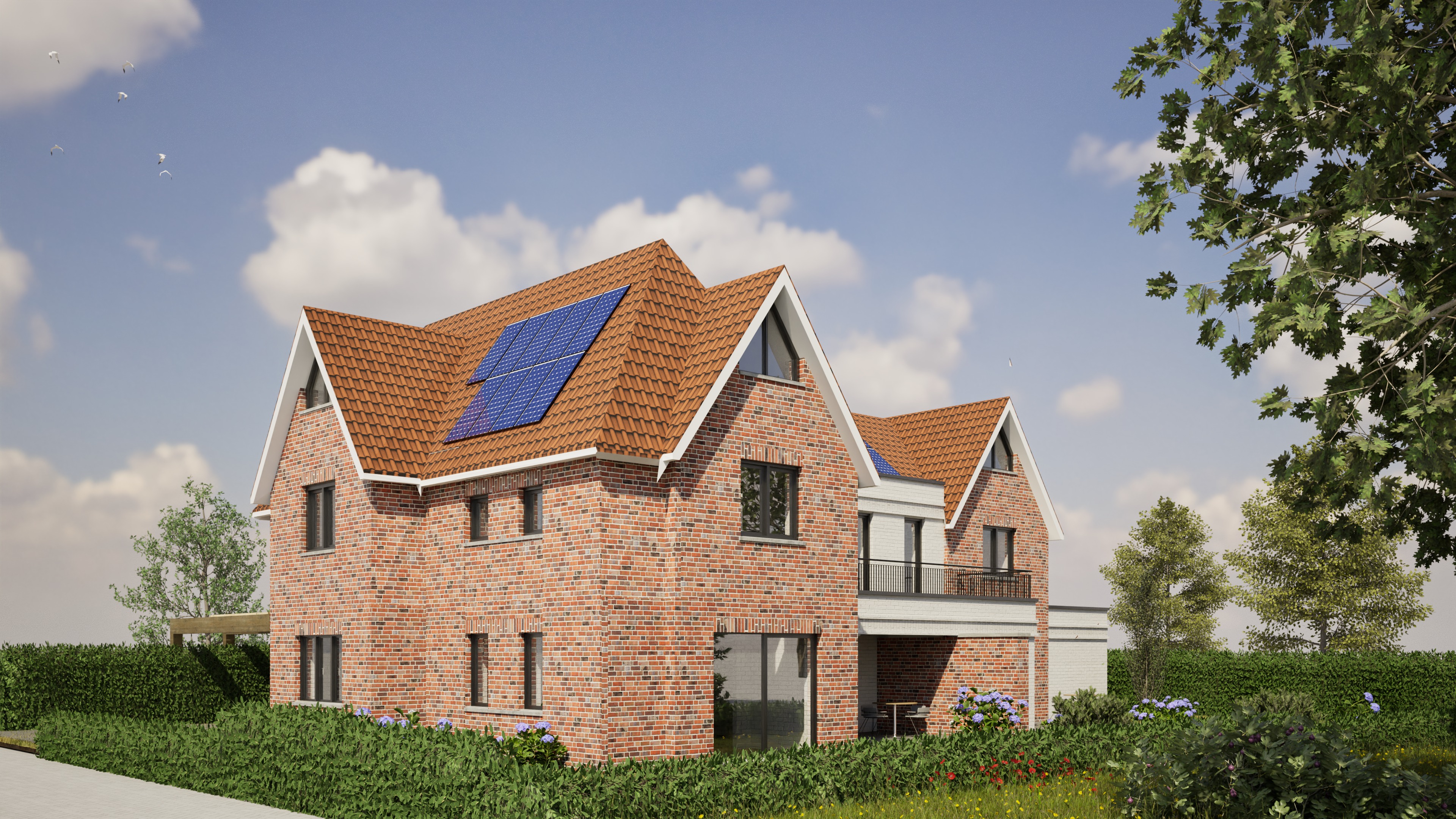 transform the input architectural rendering into a high end photorealistic architectural visualization that is indistinguishable from a real photograph style mood calm natural northern german residential architecture timeless and realistic soft daylight slightly overcast sky with subtle blue gradient no dramatic lighting architecture traditional brick residential building with red clinker bricks light mortar joints precise masonry detailing pitched gable roofs with red clay roof tiles realistic tile irregularities integrated photovoltaic panels flush with roof surface white roof overhangs and clean gutters materials details extremely realistic brick texture with depth micro imperfections subtle color variations realistic glass reflections visible interior depth balcony with slim metal railing environment landscaping lush realistic greenery hedges shrubs grass flowering plants natural variation in vegetation density and color mature trees framing the scene clean sidewalks and subtle garden borders lighting camera photographic lighting global illumination soft shadows physically accurate reflections camera at eye level slight wide angle lens 28 35 mm architectural photography composition rendering quality ultra high resolution professional architectural photography look sharp but natural focus no stylization no exaggeration key rule transform this rendering into an ultra photorealistic architectural photograph shot in summer bright atmospherical light preserve exact geometry materials colors and composition from the original image enhance only real world material behavior natural reflections roughness variation subtle imperfections apply physically accurate daylight soft shadows realistic global illumination professional architectural photography look 35 50 mm lens straight verticals natural exposure no cgi look indistinguishable from a real photo korregiere leichte fehler im rendering und stelle die klinkertexturen nahtlos dar die wei e fassadce besteht auf wei gestrichenem klinker hintergrund rechts b ume links oeben hintergrund nachbarhaus angedeutet links unten vordergrund pflasterung realistisches glas durch das man etwas innenraum erkennen kann f ge dachrinnen und fallrohre aus zink dezent hinzu licht aus betrachtersicht nur ein fallrohr pro geb udeseite statt zwei links eins links und eins rechts neben die giebelwand fallrohre in die innenecken nicht an die au enecken alle seiten belichtet belichtung leicht von links