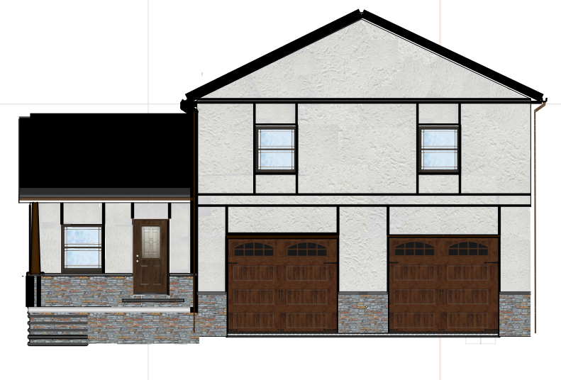 modern exterior shot create a realistic and beautifully rendered image of a modern house exterior the house features a cream colored stucco facade with bold black trim the garage doors are made of rich mahogany wood complemented by a natural stone base in shades of grey and brown the front door is a deep walnut brown with frosted glass the roof has a matte black finish and large clear windows reflect the serene blue sky the atmosphere is bright and inviting with afternoon sunlight casting soft shadows lush greenery surrounds the scene enhancing the welcoming and peaceful ambiance architecture