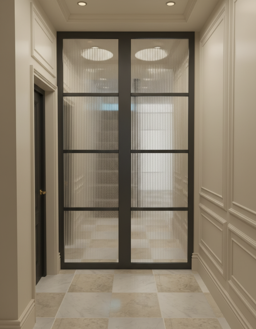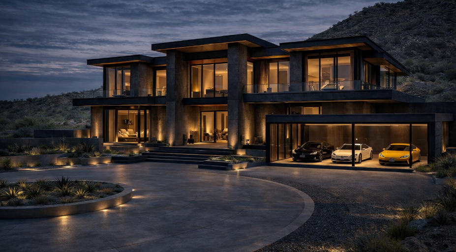 generate a photorealistic interior of a modern luxury residence designed to match the exterior architecture and style the space should feel dark sophisticated and opulent using a palette of deep tones like charcoal black dark wood and rich metallic accents include modern furniture clean lines layered textures and subtle ambient lighting that enhances the luxurious mood ensure the interior layout feels realistic and coherent with the exterior view showing depth shadows and natural light from windows where appropriate reflect attention to high end details materials and finishes emphasizing elegance and contemporary design