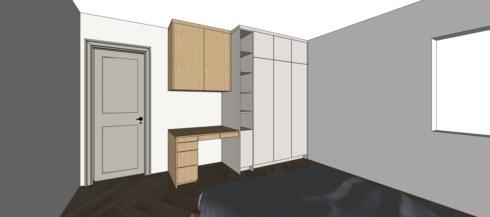 render a modern neutral bedroom interior with sleek minimalist design maintain all the design and finishes applied in this model use a palette of light oak for the cabinets and shelves balanced with off white off white for cabinet doors the floor is a rich herringbone neutral light wood adding depth and warmth the walls are a soft neutral white to enhance the spacious feel the atmosphere is bright and airy with natural light streaming through a large window and patio door room doors are neutral taupe with black hardware add flower vase and table light on the desk decorate shelves add under cabinet lighting add white light filtering blind there are no ceiling lights bring ample natural lights through window