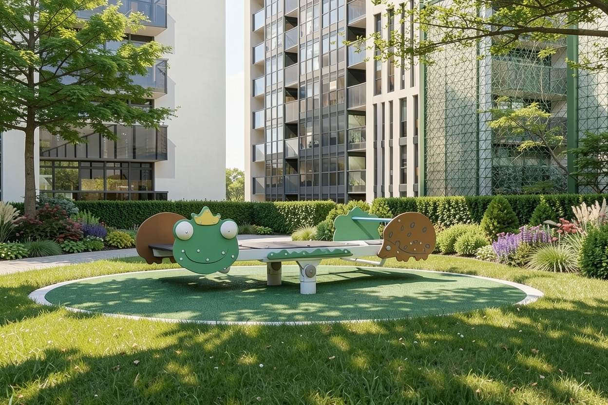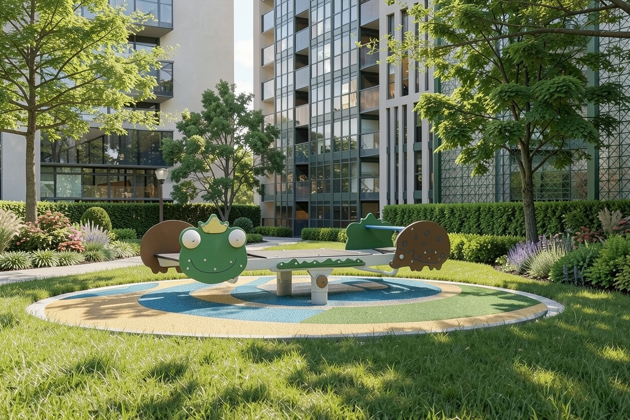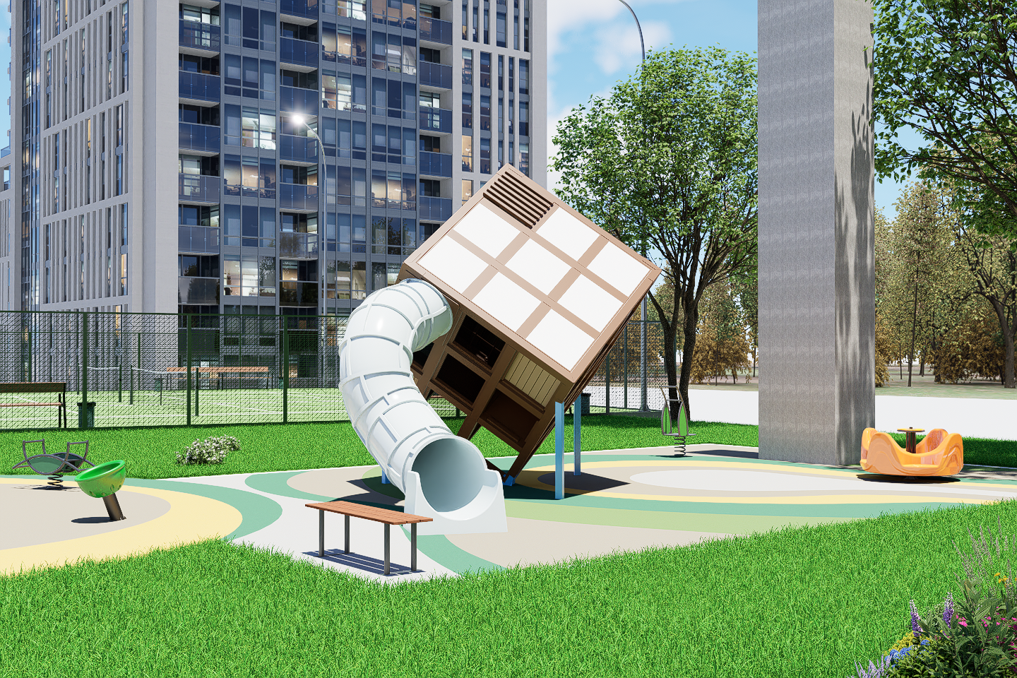 don t change the playground epdm colour do not change the original playground layout or angles the setting should remain clearly outdoors surrounded by lush well maintained landscaping including mature trees layered shrubs shrubs and hedges should form a boundary separating the playground from adjacent areas the ground treatment around the playground should consist of well kept grass and appropriate outdoor safety surfacing blending naturally into the surrounding lawn and landscape at the left handside is tennis court add realism