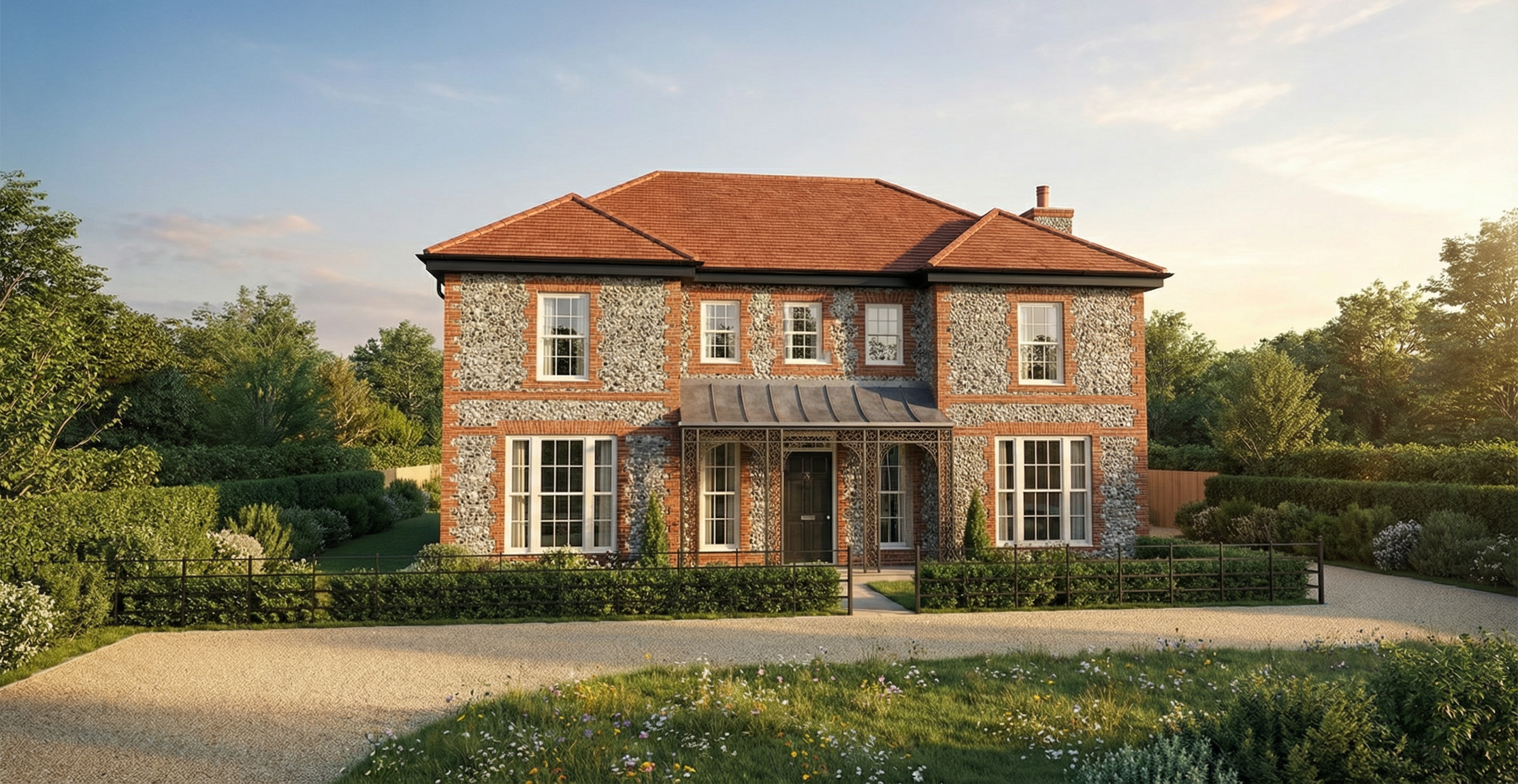 generate a hyper realistic visual of this exact image do not change the view the house is traditional flint with red brick detailing white windows and white fascia and soffits the entrance detail is lead and wrought iron make the fence a black post and rail fence with a cream resin bound front driveway the planting is to look semi rural but manicured with some wild planting in the central grassed area make the image aspirational and classy and don t change design or proportions or camera angle