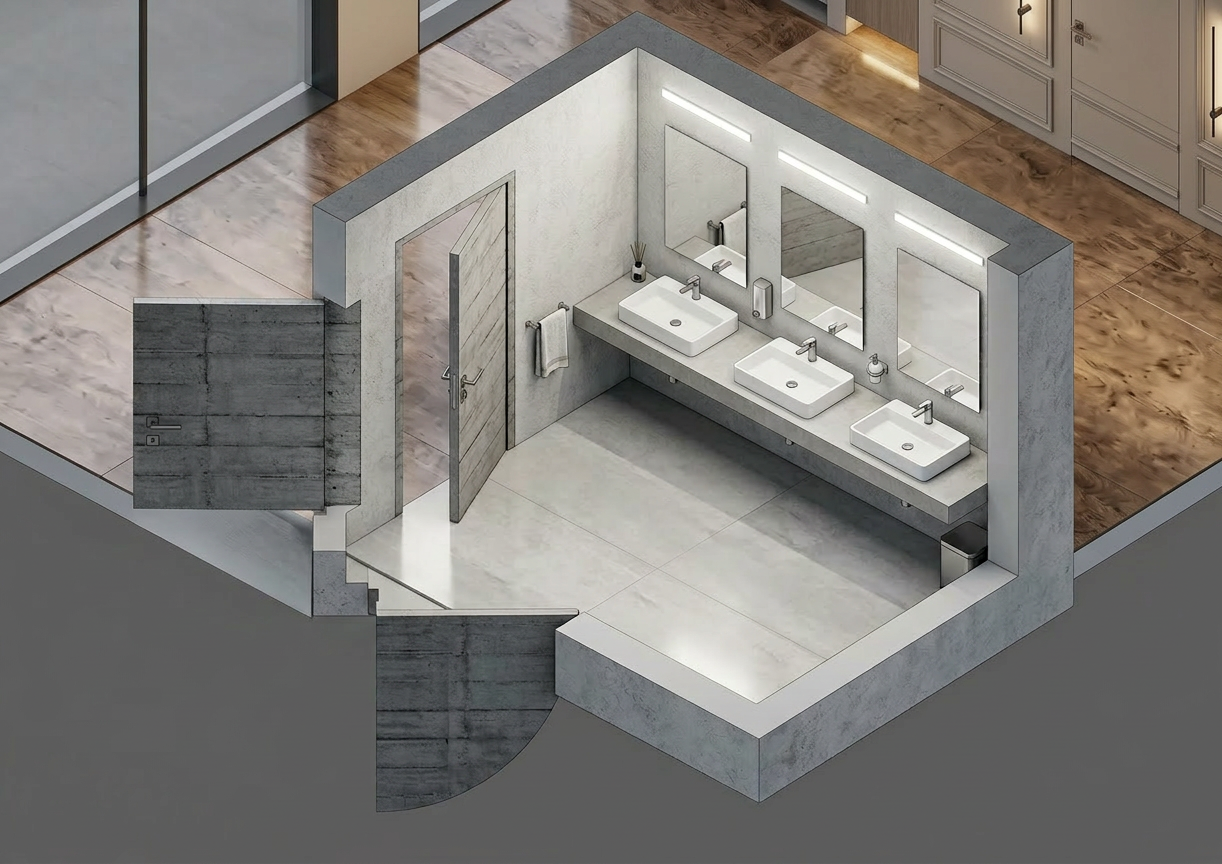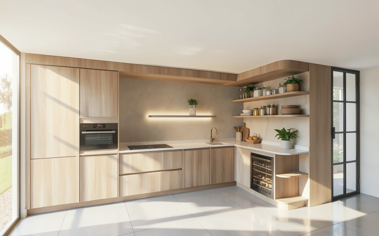 use the provided render strictly as the base image do not change the camera angle composition lighting furniture placement materials architecture or any other elements in the scene modify only the rabbit and the hay inside the cage under the cabinet change the rabbit s fur color to predominantly black with a distinct white neck chest area keep the same pose and position but make the rabbit slightly smaller so it looks natural and proportionally realistic inside the cage change the rabbit s ears so they hang down naturally on the sides of the head lop ears instead of standing upright reduce the amount of hay in the cage so that only a small minimal layer of hay remains on the bottom the rabbit must clearly appear behind the metal cage bars the cage bars must remain fully visible in front of the rabbit so it is obvious that the rabbit is inside the cage and not in front of it preserve correct depth and occlusion between the cage bars and the rabbit do not modify anything else in the image