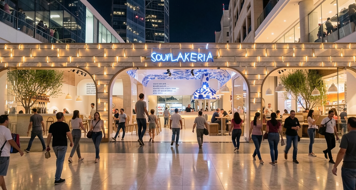 import the same basic concept souvakeria brand name food casual restaurant in a new local ambient market road or e central square or in un place when you though for better commercial location in dubai use light pergolas or umbrellas with the same graphic design pattern who exist in interior central roof blue and white if use service outdoor under the street food style benches and tables or semi stands for sitting food area