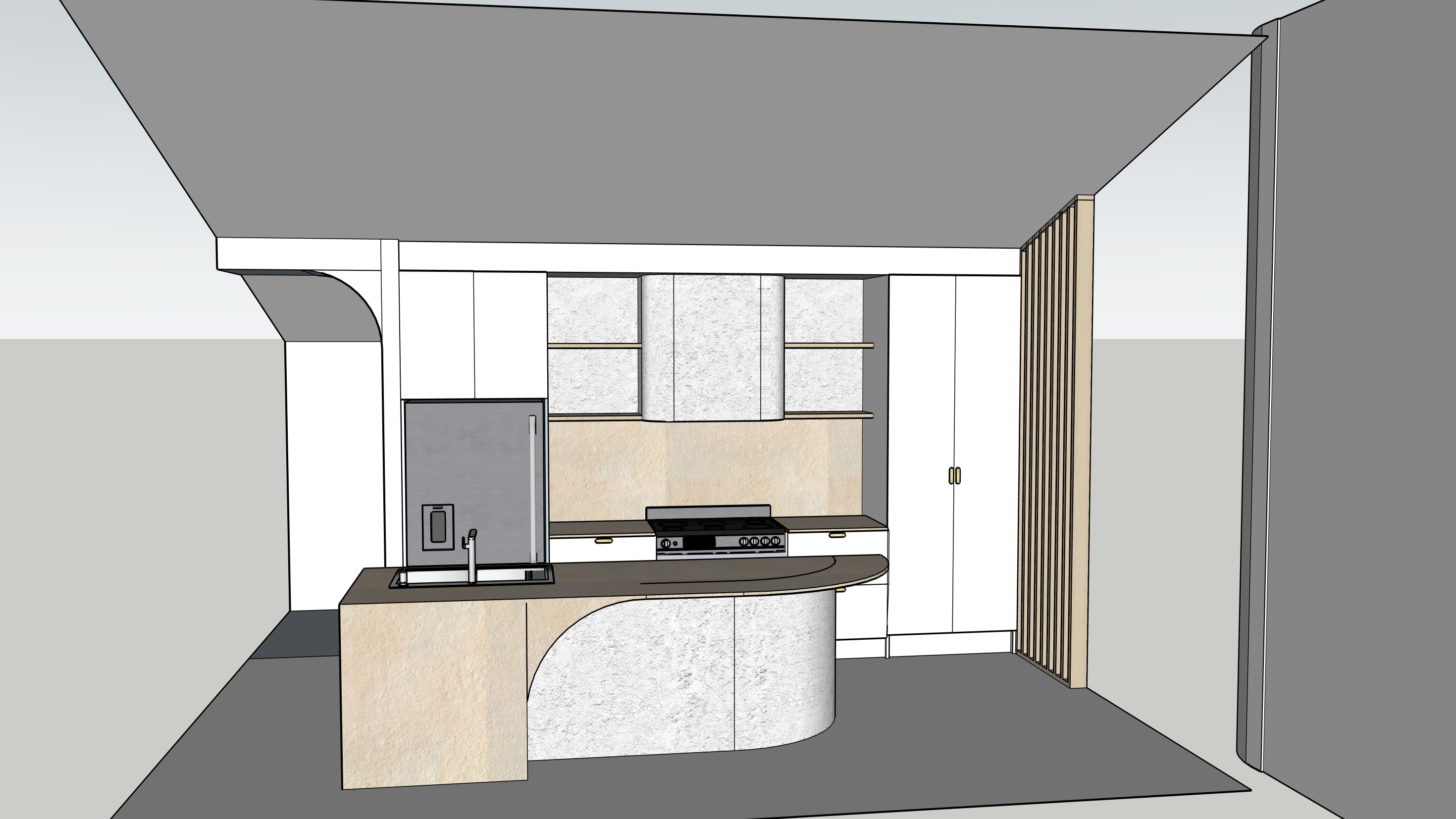 the underside of the island is coated in microcement along with the range hood and walls next to the micro colour will me similar to a dulux hog bristle quarter the timber used in the shelves and batten wall will be australian costal blackbutt we will be using a travertine tile for the flooring stone used on the island and splash back is taj mahal quartzite