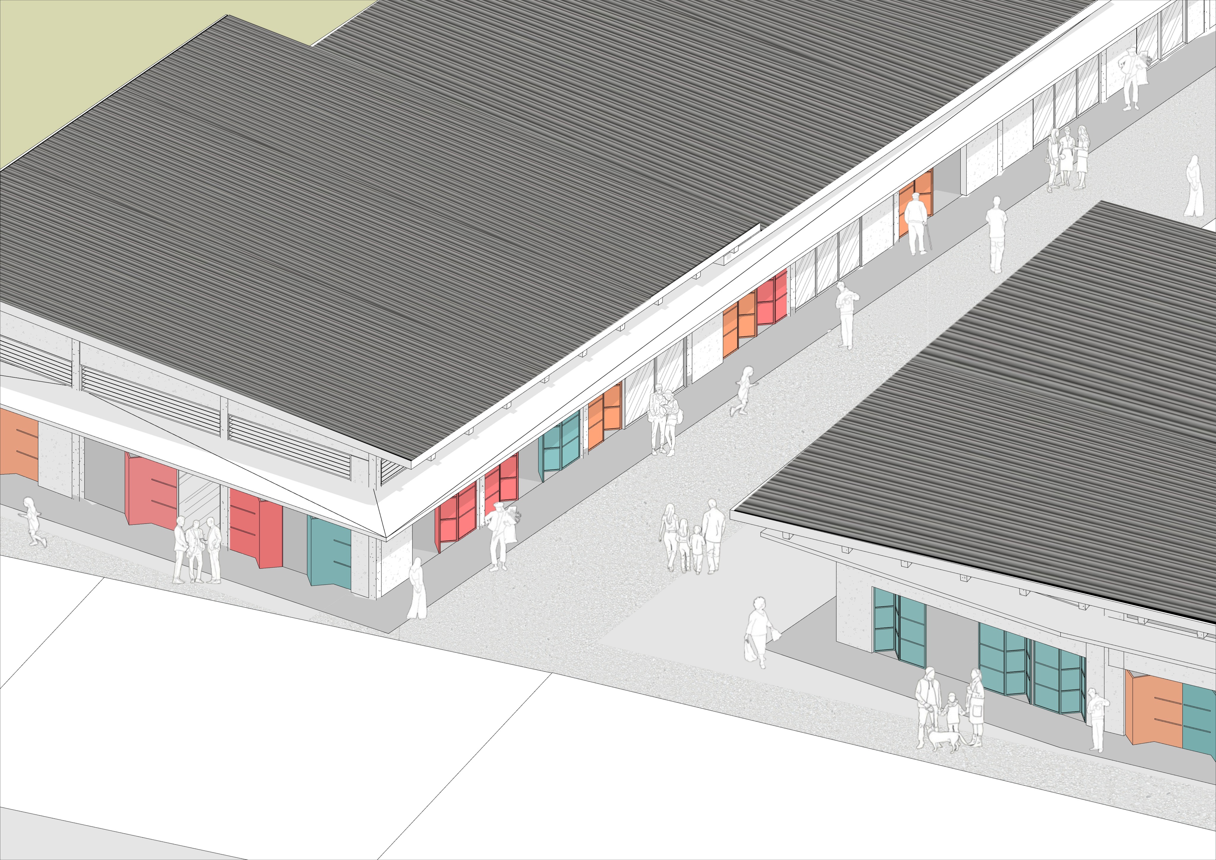 do not make it real remain cartoon vibes and then can you add more people do not change texture and then add fiesta banner lantern on the middle only use subtle pastel colors do not add people on roof