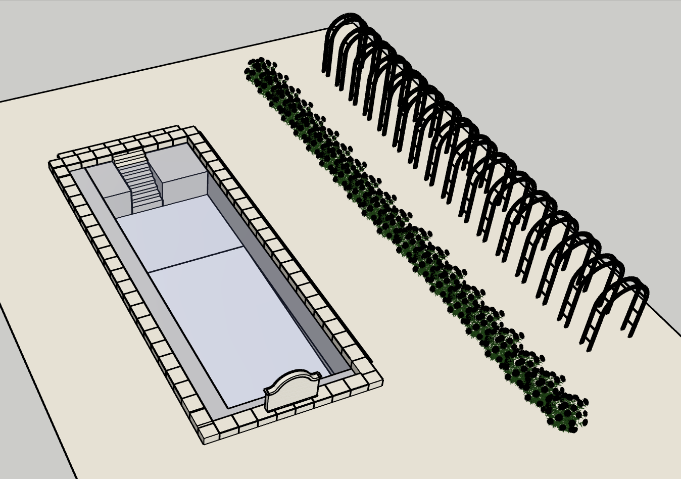 exterior shot keep the pool and the fontain as it is drawn add realistic flowers and herbs around the swimming pool architecture