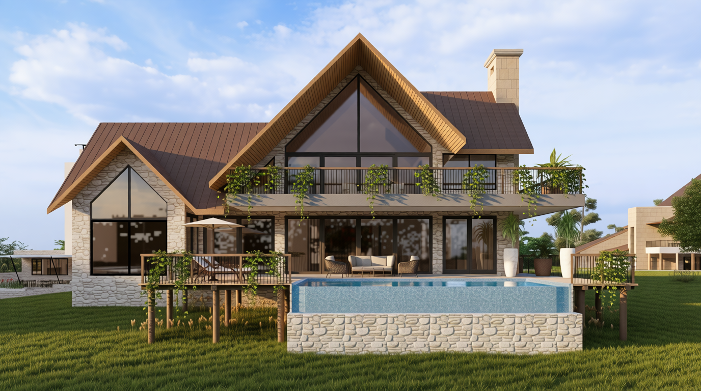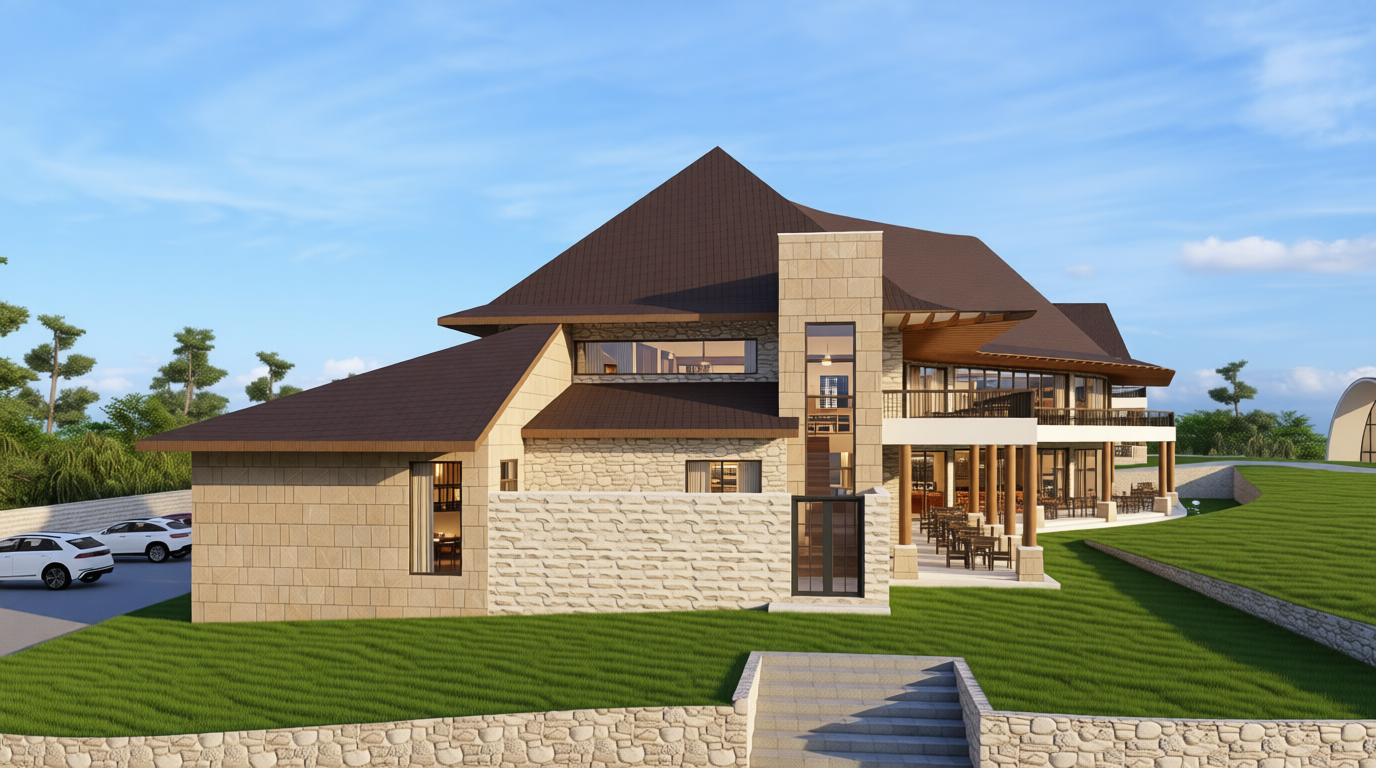 this is a resort restaurant enhance the scene by making it look a bit lived in make grass look more realistic add vry few trees to the compound retain roof texture