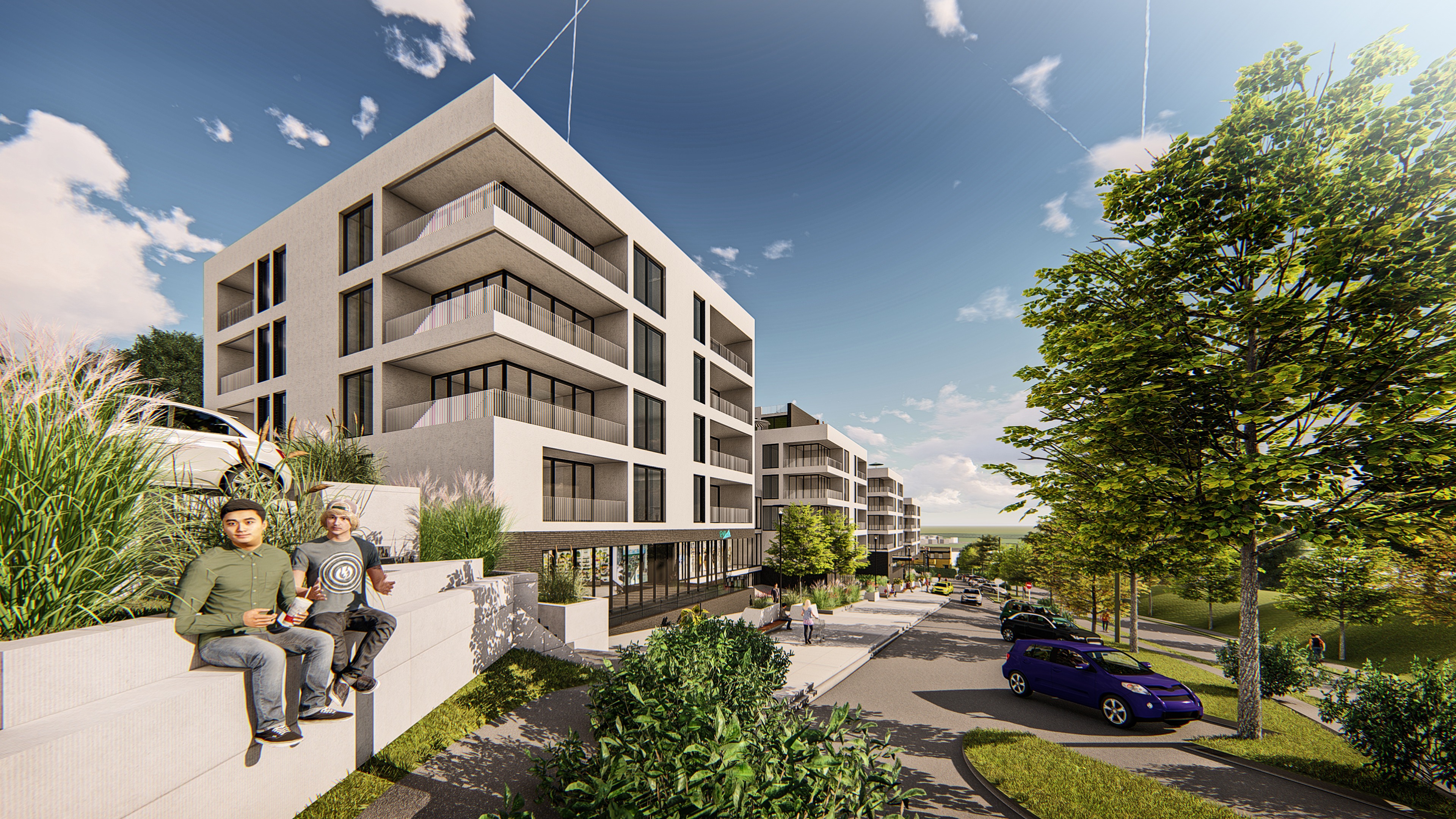 important preserve the existing geometry and the existing context exactly as provided do not modify alter reinterpret add remove scale or reshape any geometry do not change the site surroundings street layout neighboring buildings vegetation or context elements do not modify geometry scale proportions buildings road layout sidewalks or surrounding context in any way do not change text photorealistic architectural rendering clean and balanced contrast calm cinematic mood style contemporary european residential architecture minimalist premium understated include people subtle motion blur for realism do not add new people do not change the green space do not change the sidewalk do not change the road add reflection of the sorroundings to the windows