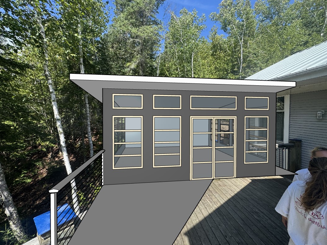 make the windows white to match the others the siding on the new gazebo structure should match the building blend the brown decking in on the floor dont alter the background add some wall sconces