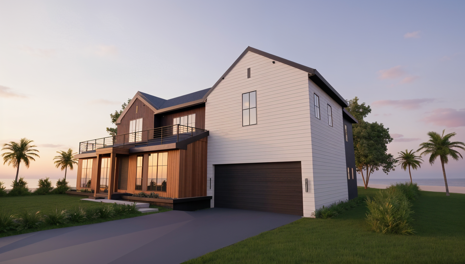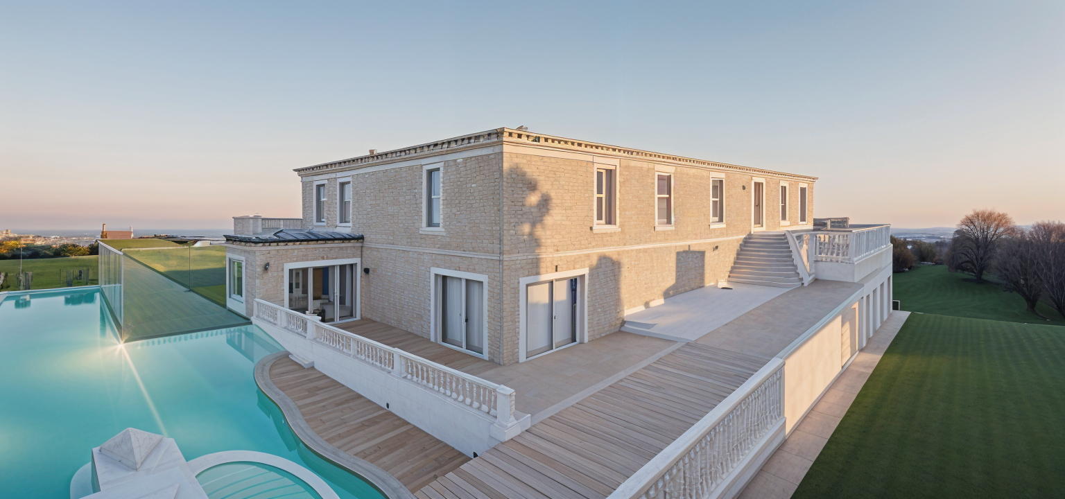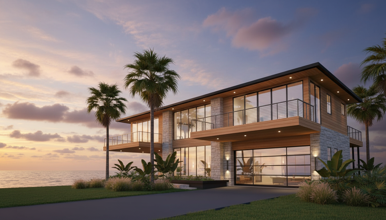 luxury chalet style home with timber beams stone foundation large windows overlooking forest landscape snow capped mountains in the background twilight lighting with warm interior glow through windows