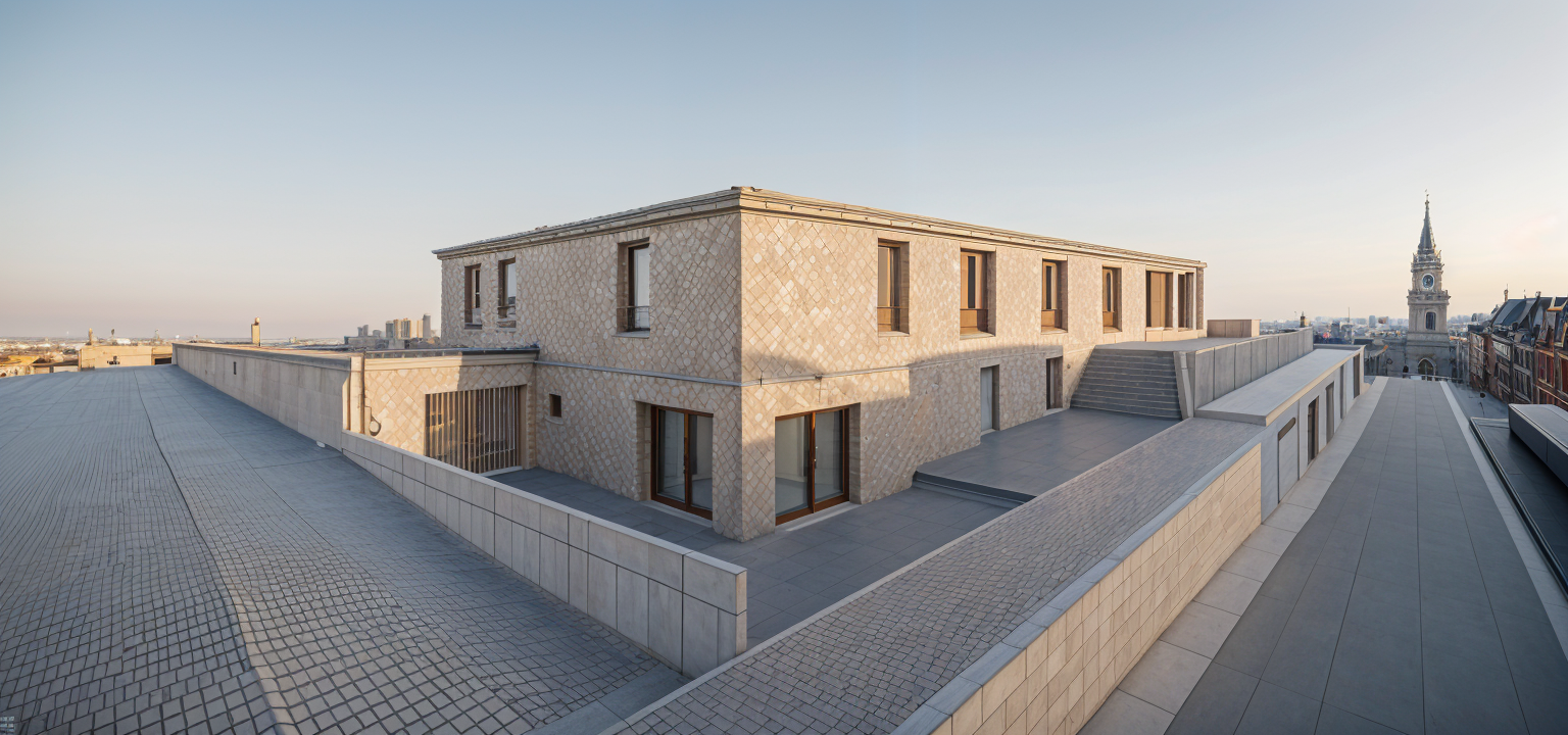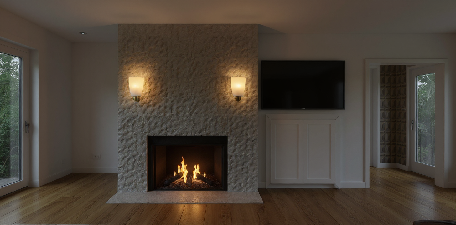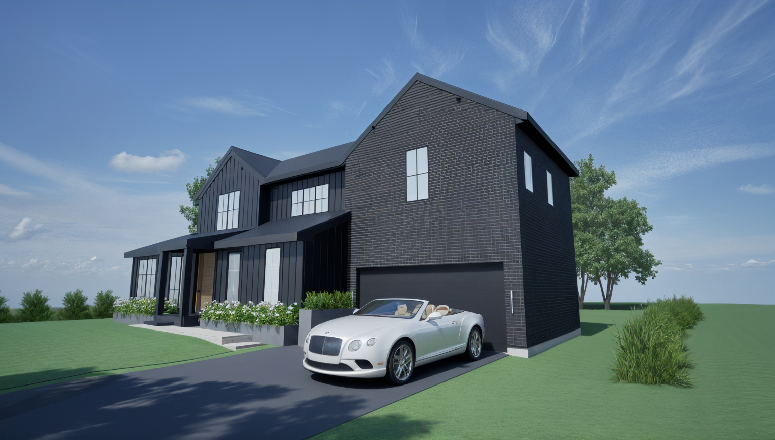 luxury chalet style home with timber beams stone foundation large windows overlooking forest landscape snow capped mountains in the background twilight lighting with warm interior glow through windows