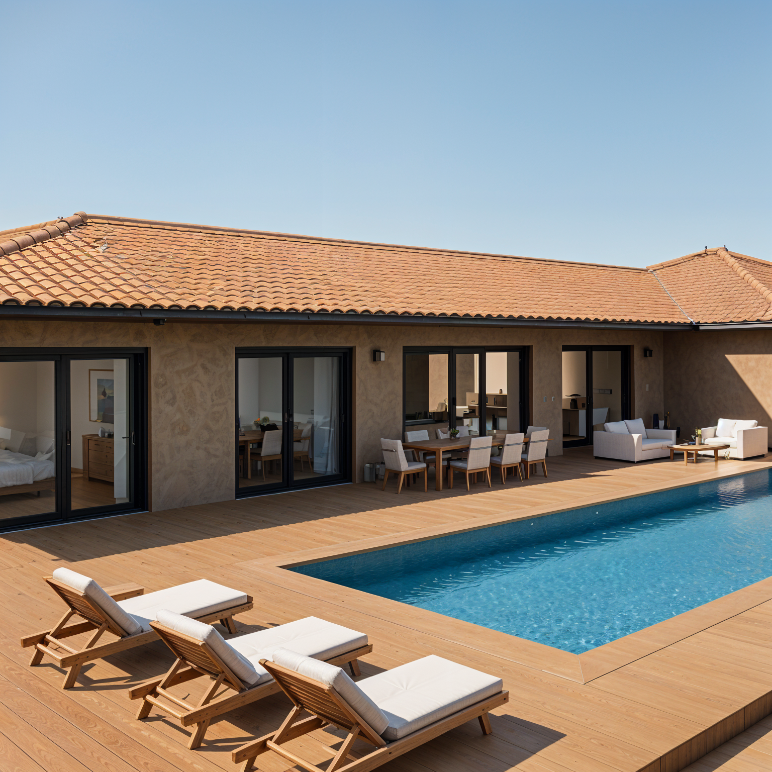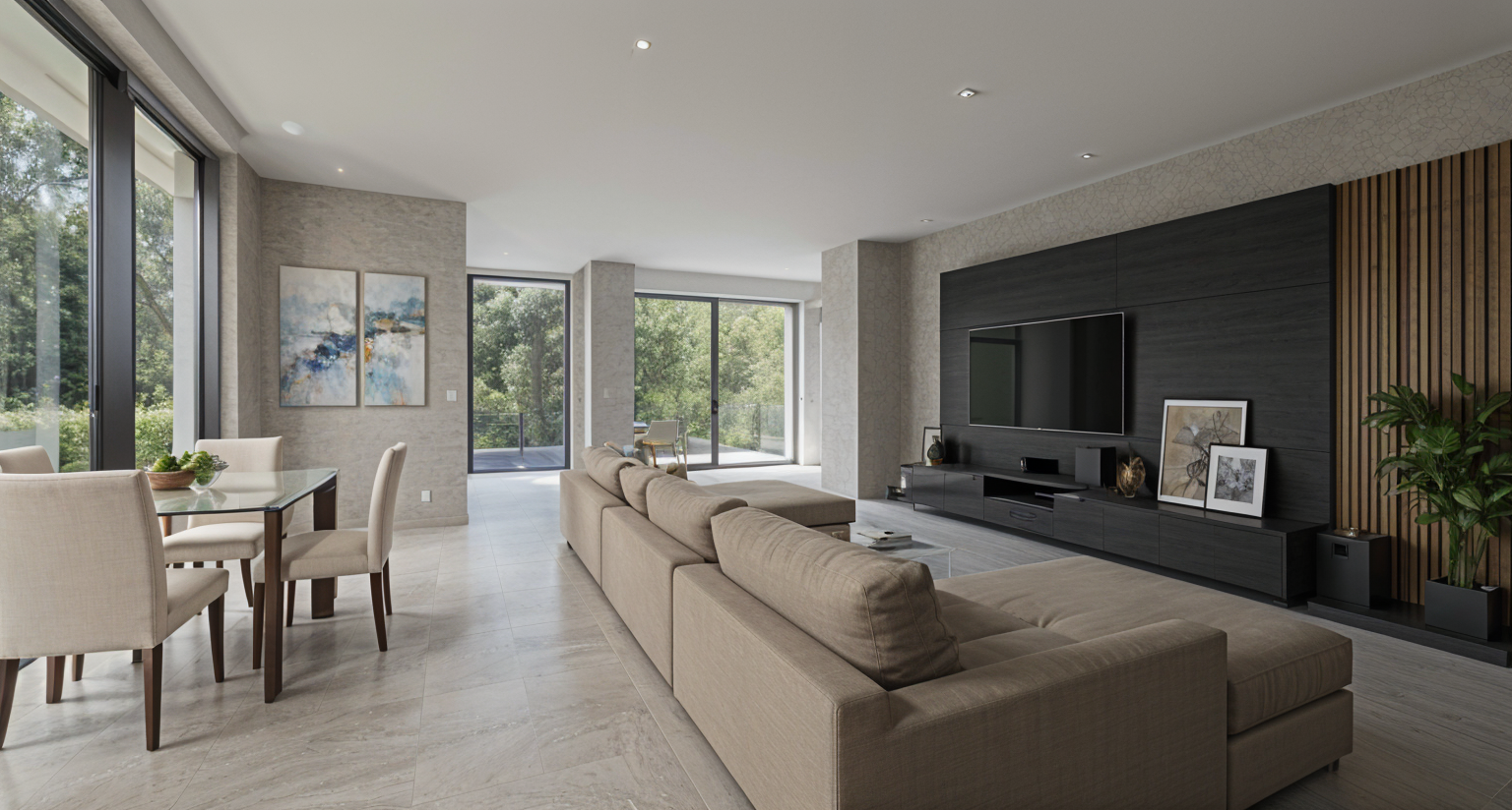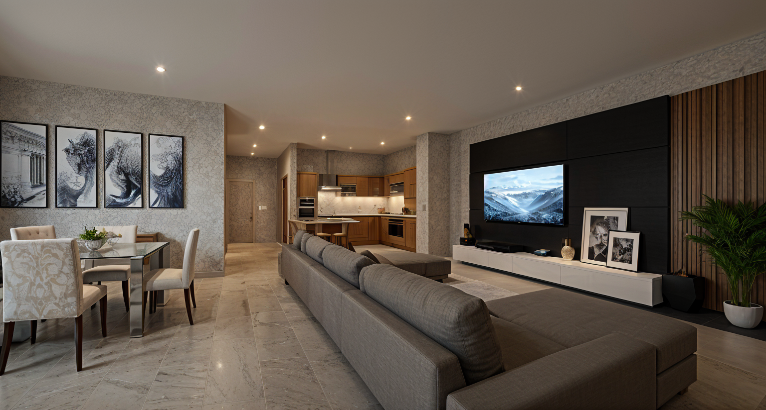 modern elegant living room on the left side there is a dining area the kitchen is located in the middle at the back on the right side there is a modern living room setup