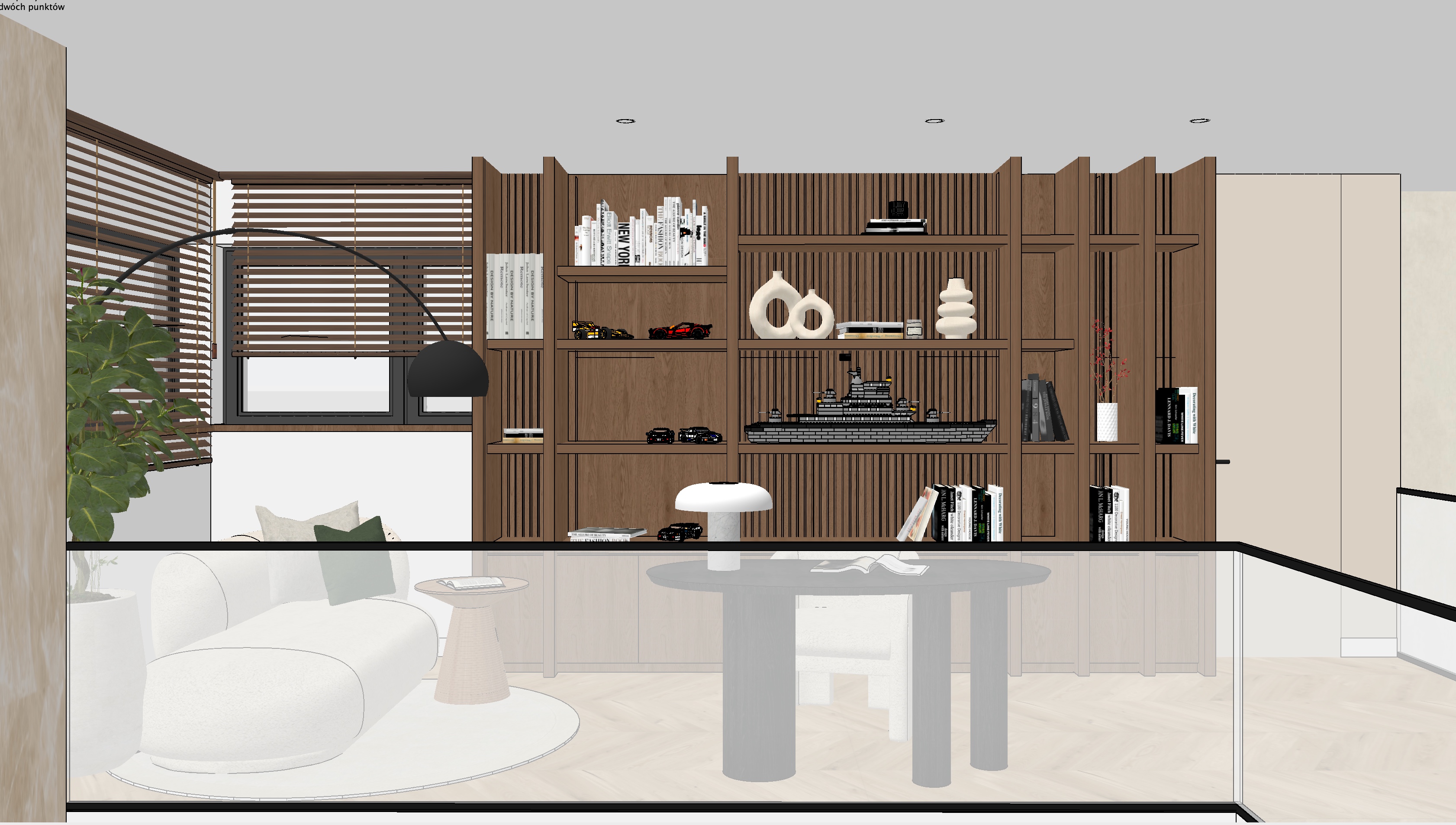 the furniture built in is in the color of warm walnut and the shelves are lit horizontally