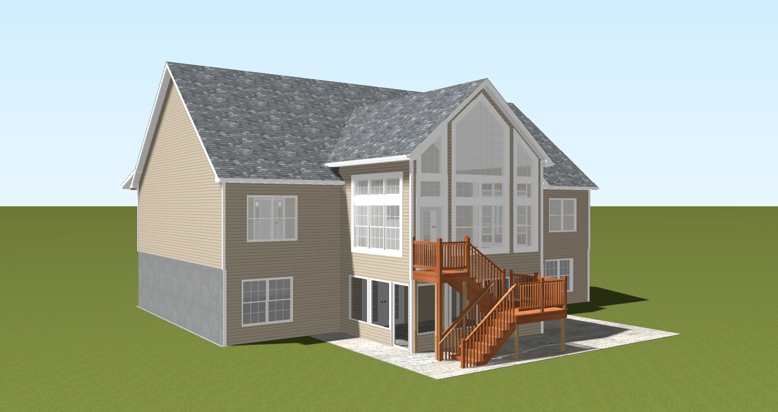 show home on a sloping lot from the front of the home to the rear add a driveway along the right side of the home leading further to the rear add tree line in background and on left side
