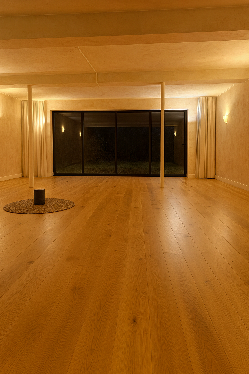 make daylight only change the far back wall of this room remove the current rear wall and replace it with one single full width black aluminium sliding glass wall requirements exactly 4 glass panels exactly 2 outer fixed panels exactly 2 middle sliding panels symmetrical layout slim black aluminium frames modern metaglas xhs style total width about 7 5 metres height about 2 25 metres full wall width appearance low minimal threshold clear insulated glass elegant luxury architectural look very important keep the same room keep the same camera angle keep the same floor keep the same curtains keep the same ceiling keep the same lighting do not redesign the room do not add furniture do not create a separate room behind the glass do not place another interior behind the glass behind the glass there should only be subtle outdoor light garden feeling the glass wall must sit exactly where the current rear wall is composition the new sliding wall must fill the rear opening from left to right black vertical mullions dividing the wall into 4 equal sections the 2 middle panels are the sliding doors the 2 outer panels stay fixed make it look built in and realistic render goal photorealistic interior edit focus on replacing the rear wall only no extra architecture inventions no technical drawing no facade view no showroom scene no second indoor living room behind the glass
