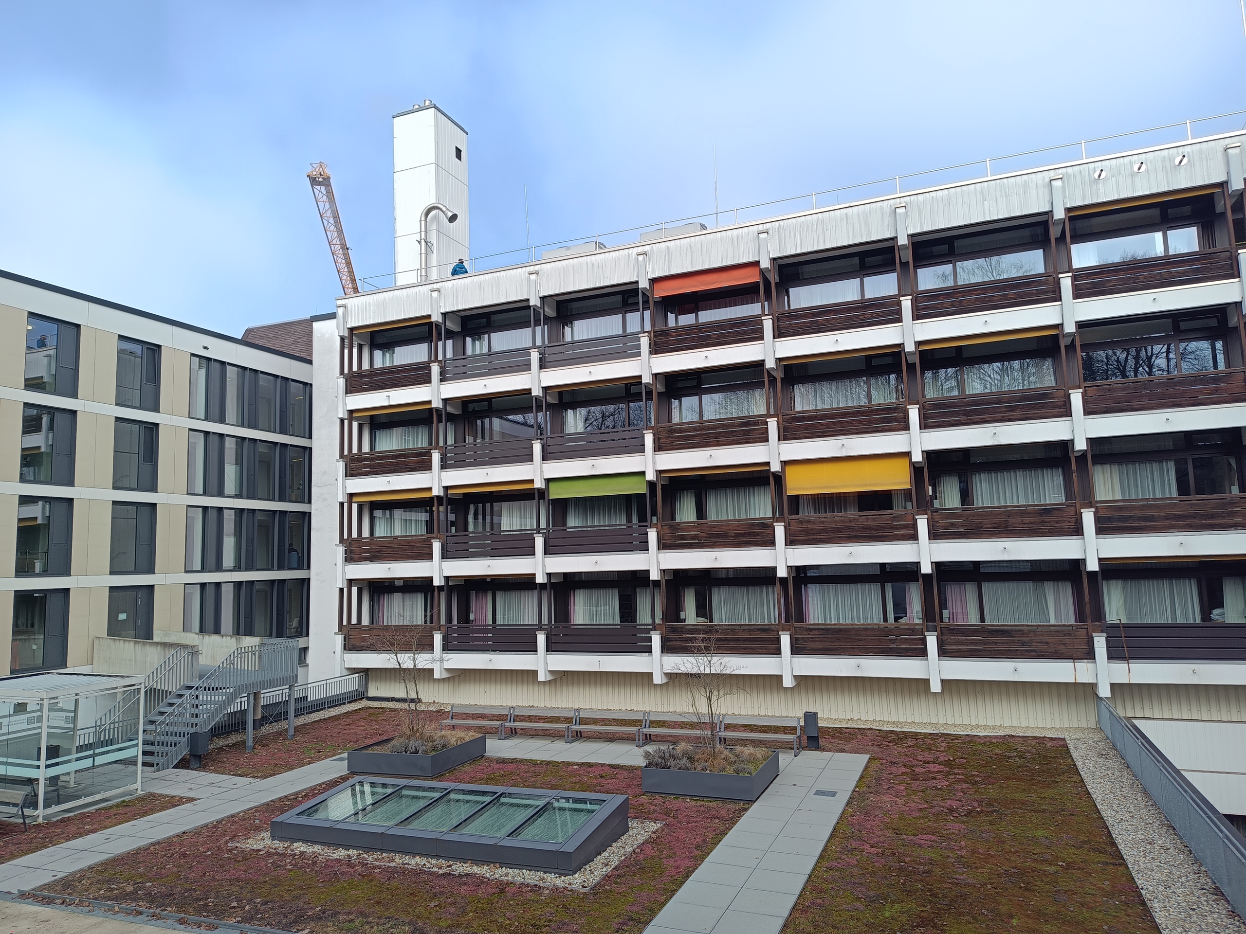 please make a proposal for a modern renovation of the facade with the wooden balconies in the perspective please make sure to adapt it to the already renovated building in the reference image however keep the balconies