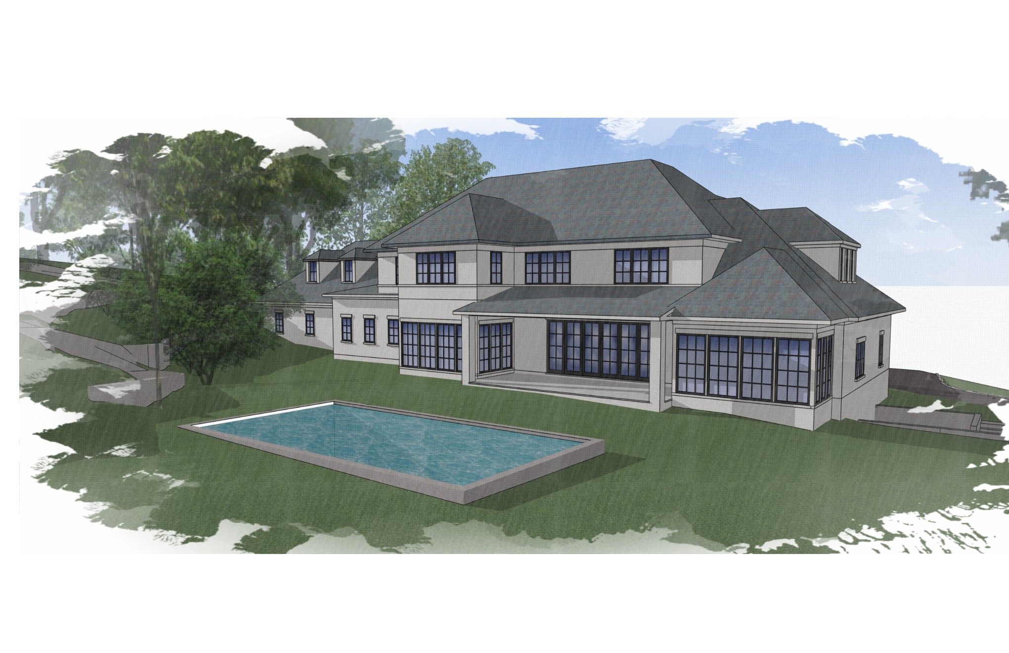 please create realistic rendering with realistic materials realistic landscaping with additional landscaping around the home such as small garden beds around the permiter of the home keep driveway as shown keep house as main focus house is all stucco no stone lighting is to bright and direct