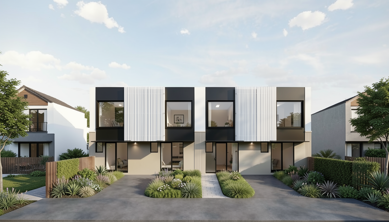 exterior shot 3 storey townhouse using black and white paint as main colour tone