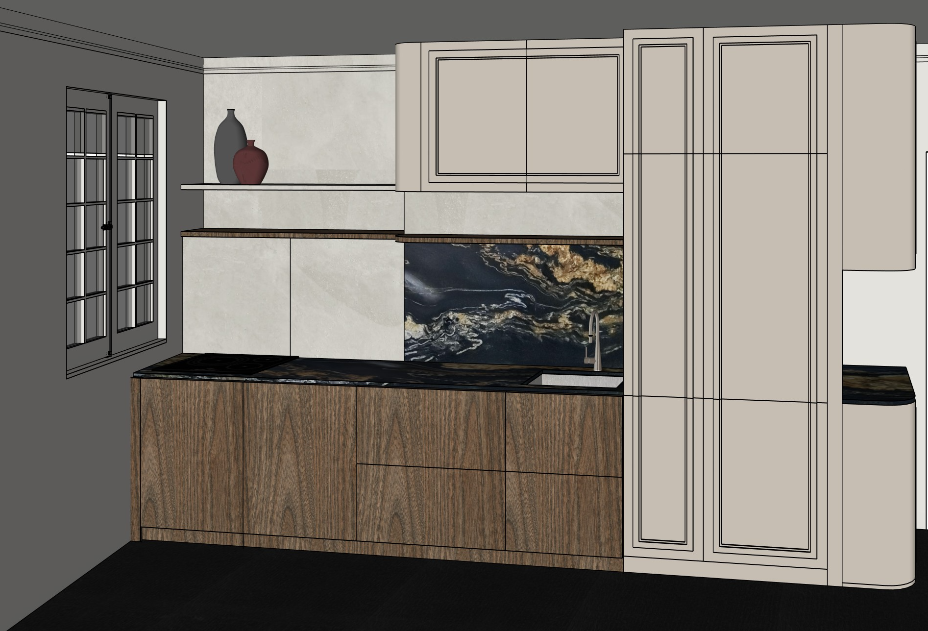 the appartment is on the 6th floor in a parisian building the walls are lightly plastered the floor is in very dark wooden floor there are no furniture buttons there is a double door beneath the wooden shelf on the left which is lightly plastered in light greige the frame of the window is the same color as the walls the espagnolette bolt on the window is in bronze the upper cabinets and the columns are in the same greige color the walls and ceiling are in the same light plastered greige the wall with the window is not plastered style like colin king
