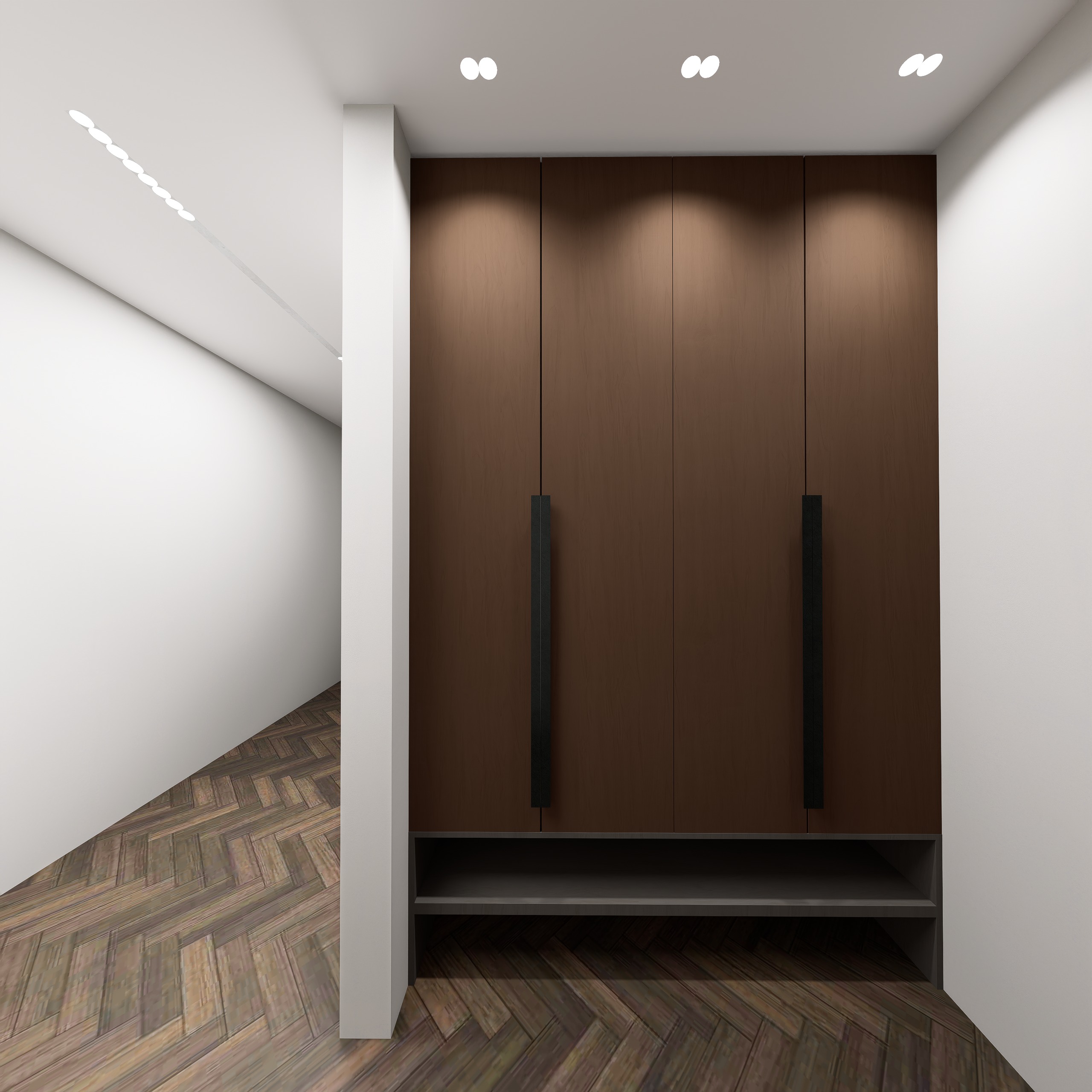 ultra realistic architectural interior render of a modern built in wardrobe area maintain the exact camera angle geometry and layout from the uploaded render do not modify the architectural structure or furniture proportions the wardrobe should be finished in high quality natural wood veneer that matches the wood tones used in the bedroom using warm walnut dark oak textures with realistic grain subtle variation and matte lacquer finish wood should look premium and consistent with the room s flooring and headboard wood tones wardrobe doors should be minimal modern flat panels with long vertical matte black handles sleek and elegant add subtle reflections and realistic edge detailing above the wardrobe install soft warm recessed spotlights 3000k casting gentle illumination down the wood panels to highlight the texture and grain creating a luxury interior lighting effect the open lower shelf beneath the wardrobe should be finished in a dark neutral matte material slightly reflective and clean suitable for placing shoes or decor walls should remain soft warm off white light beige matte paint to match the minimalist bedroom palette maintain clean modern surfaces with realistic plaster texture flooring should remain dark herringbone wood flooring enhanced with photorealistic wood grain natural variation and subtle reflections matching the wood tone palette used throughout the bedroom lighting setup soft architectural ceiling downlights gentle ambient interior lighting realistic global illumination with soft shadows rendering style ultra photorealistic architectural visualization interior design magazine quality global illumination physically based rendering pbr materials ultra detailed textures cinematic lighting soft natural shadows 8k detail professional corona v ray style interior render important instructions keep the wardrobe structure exactly the same only enhance materials lighting and realism wood texture must match the bedroom design palette