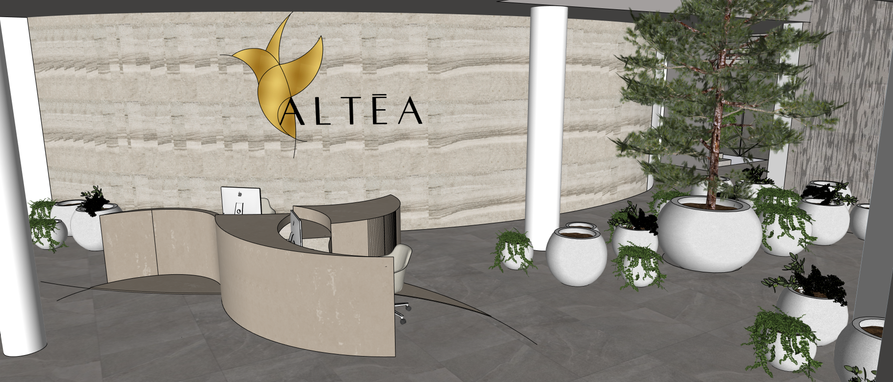 interior shot pared de fondo en marmol travertino logo en dorado el nombre altea en negro recepcion en melamina alto brillo al fondo un pino natural y de fondo un muro llorn