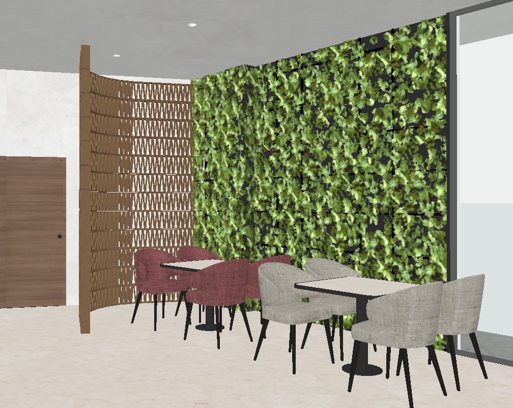 this is a modern style restaurant don t change anything just replace the objects with the same ones but with high quality make the render look real don t change any of the materials just replace the wood color like in the photo with a more realistic one and don t have too many lines replace the chairs with the same chairs but make them real don t change anything in the design just replace the materials and make the render look real make the render real let there be natural lighting too and on the right side where we have the greenery put real greenery hanging on the wall don t change anything on the walls or in the design
