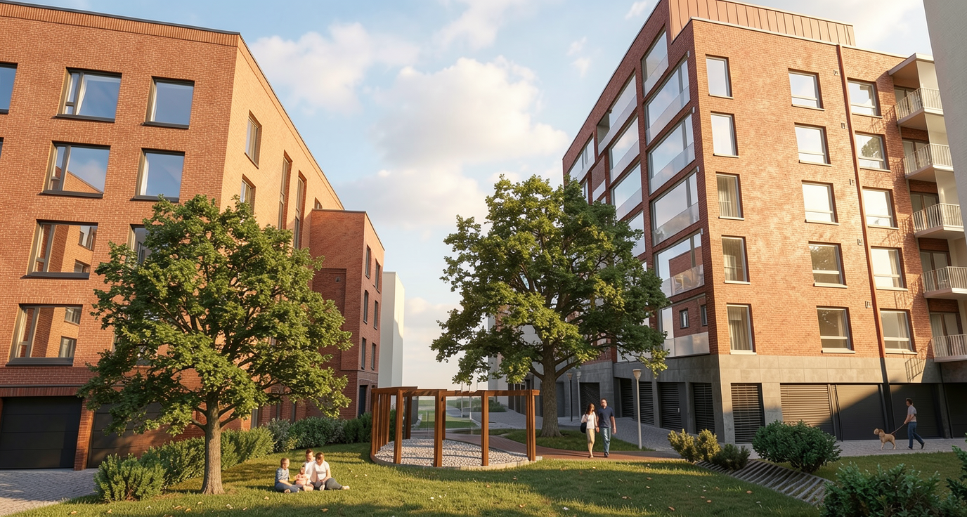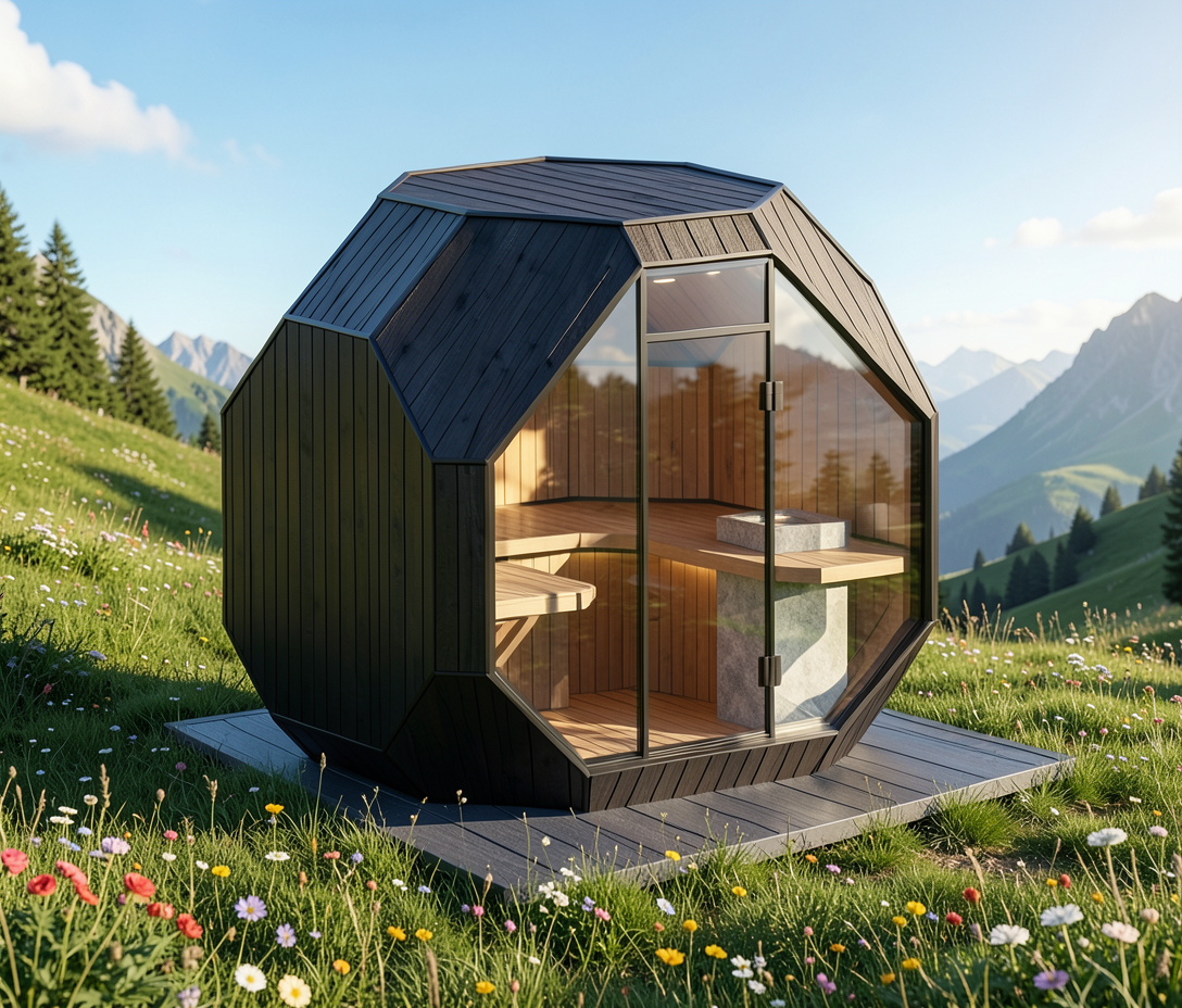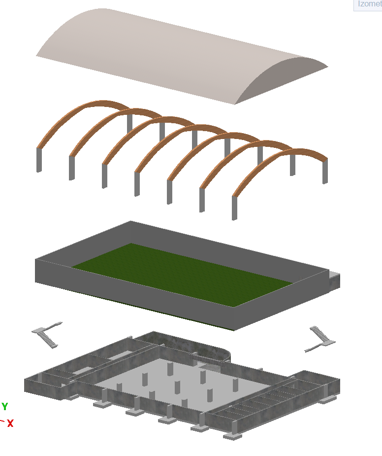 exploded axonometric architectural diagram top layer white roof membrane with arched glulam timber beams middle layer sports hall with horizontal sandwich panel walls flooring muted green turf with white handball court lines bottom layer solid raw concrete foundation slab minimalist style high quality textures soft shadows white background no text 8k resolution