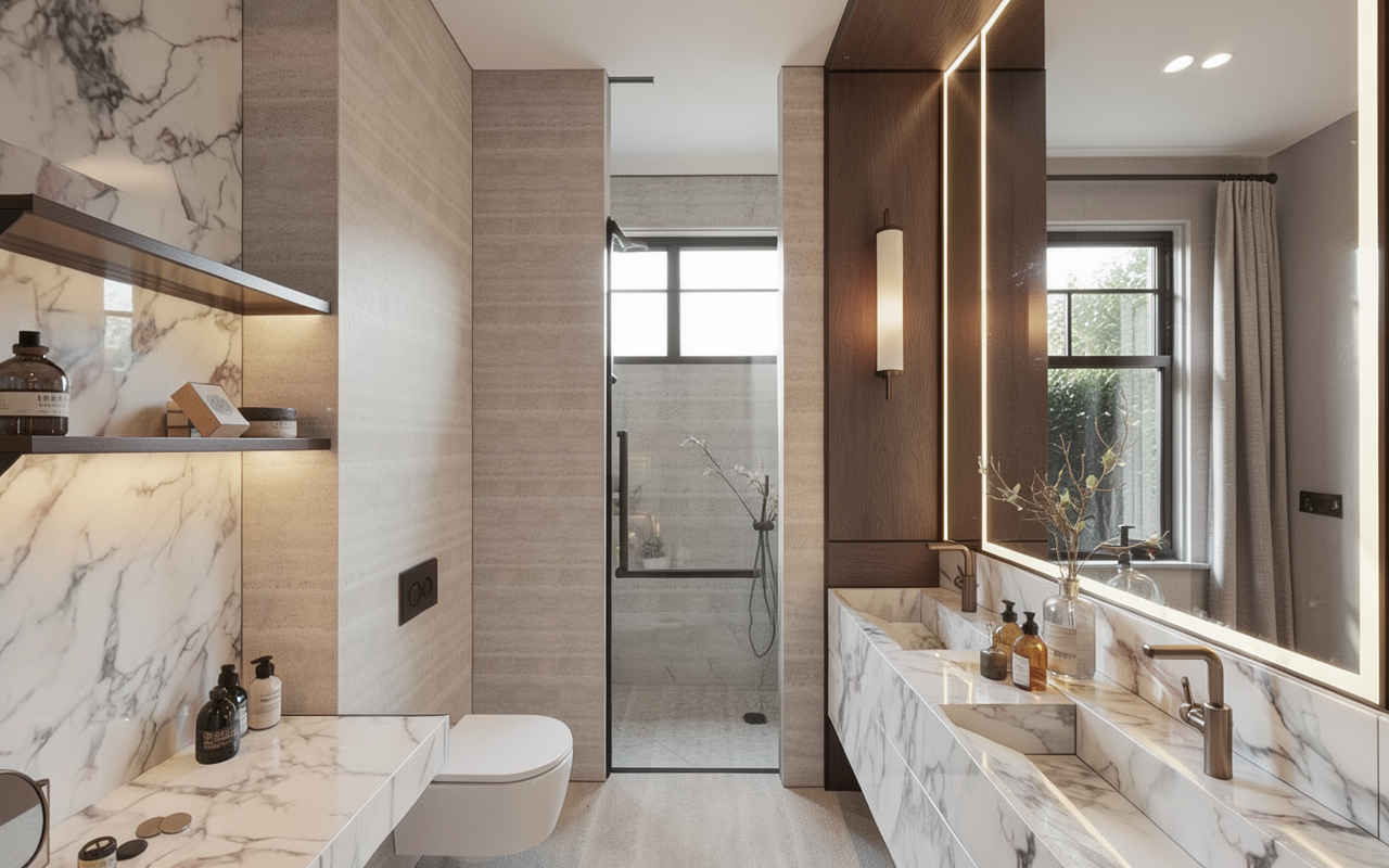 a modern minimalistic kitchen interior with a cozy inviting atmosphere incorporate soft natural lighting to enhance the space use earthy tones and materials soft sage green for the cabinet on the left light oak wood for the countertops and upper cabinets and a creamy white marble backsplash with subtle gray veining the floor is a herringbone pattern with light oak wood the pendant light above is a matte gray providing a subtle contrast the glass doors are framed in deep forest green leading to a balcony with a light yellow railing capture the essence of a serene functional space with a touch of elegance