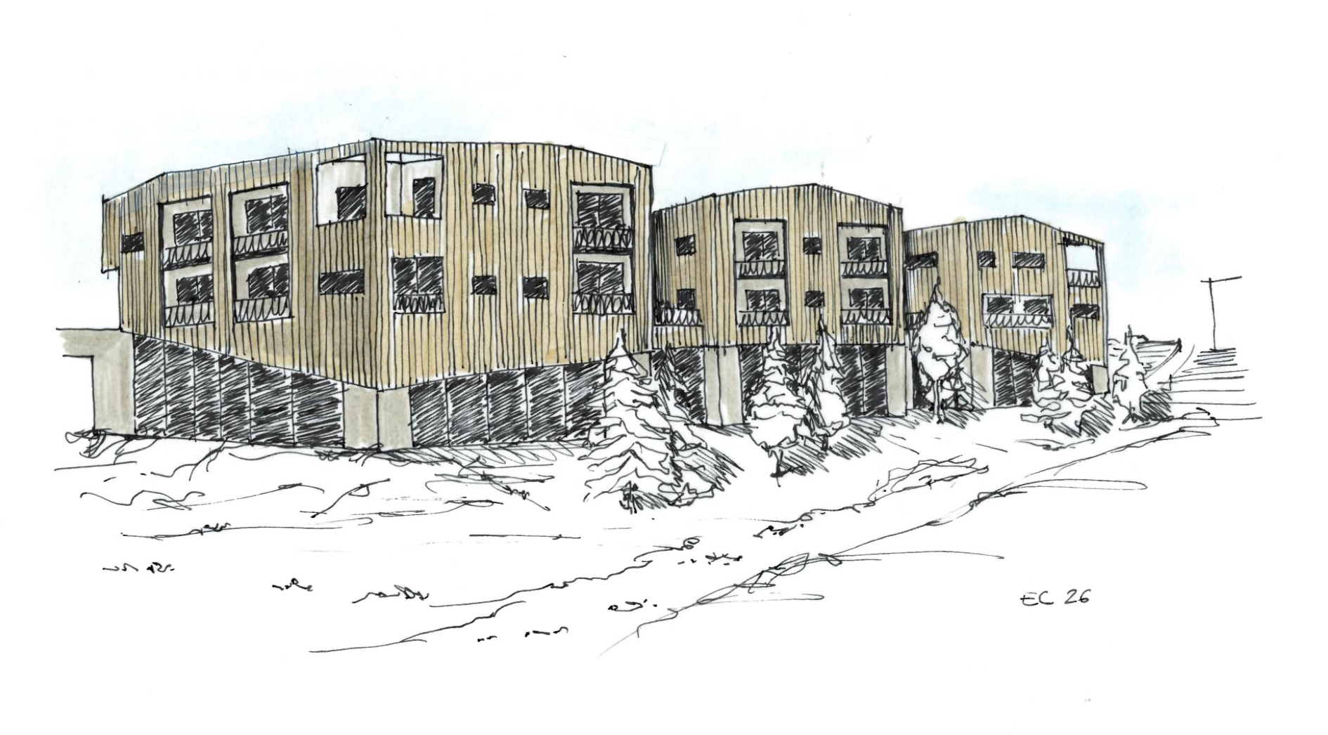 modern architectural design of two interlinked buildings with wooden facades set on uneven terrain render in a realistic style with soft natural lighting use light oak brown for the wooden panels and a muted concrete gray for the base structures include subtle grassy and rocky textures in the foreground blending into the environment set under a clear bright blue sky evoking a peaceful serene atmosphere add small detailed windows with reflections to enhance realism