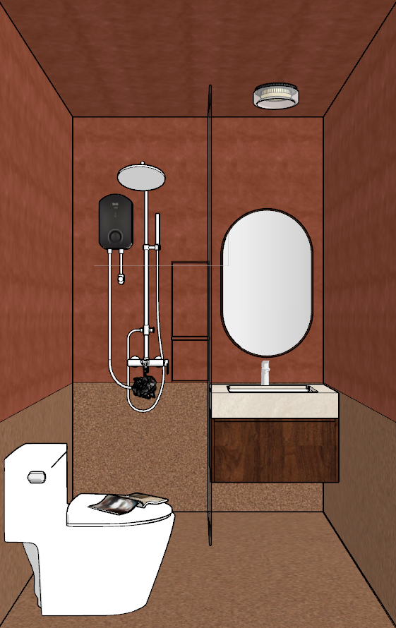 bathroom dim lighting moody spa ambience pebble wash texture lower half wall limewash texture top half of wall night time silver fittings