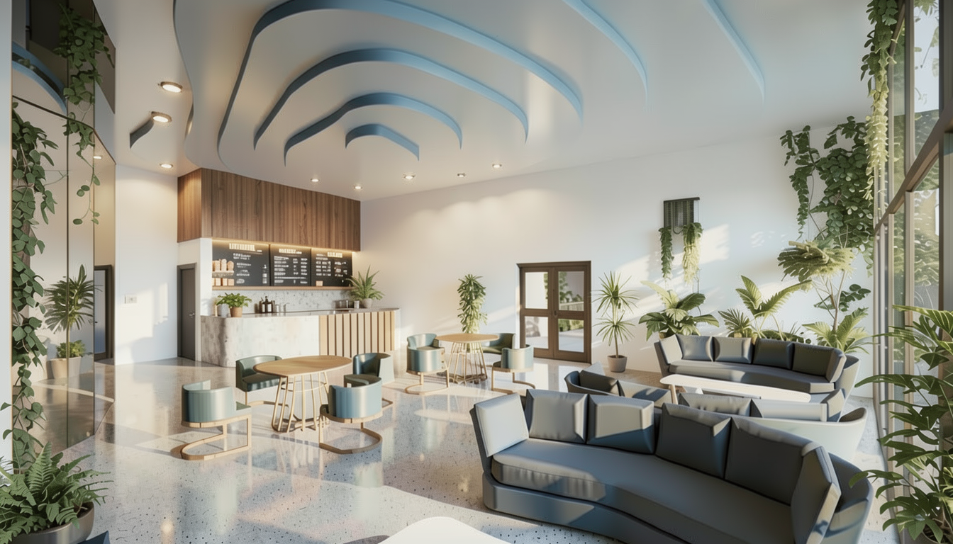white painted brick house with composition roof small standing seam roof above entry with timber post porch show at sunset with lights on