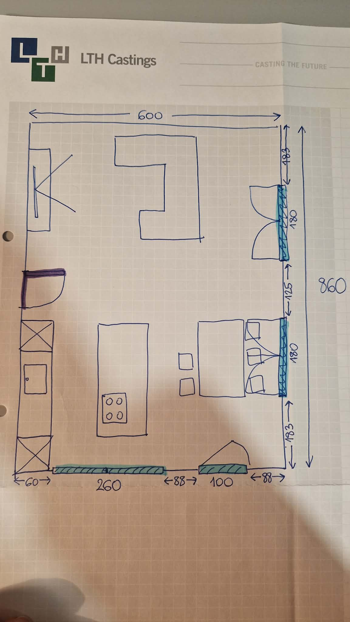 render a modern interior room layout based on a floor plan sketch the room should have a cozy and contemporary atmosphere use a neutral color palette with soft beige walls and light oak wood floors furnishings include a minimalist dark gray sofa a sleek white coffee table and a muted blue area rug add warm ambient lighting with brass fixtures and large windows with sheer white curtains for natural light incorporate indoor plants for a touch of greenery and decorate with abstract art in subtle hues ensure the space feels open and inviting reflecting modern living aesthetics