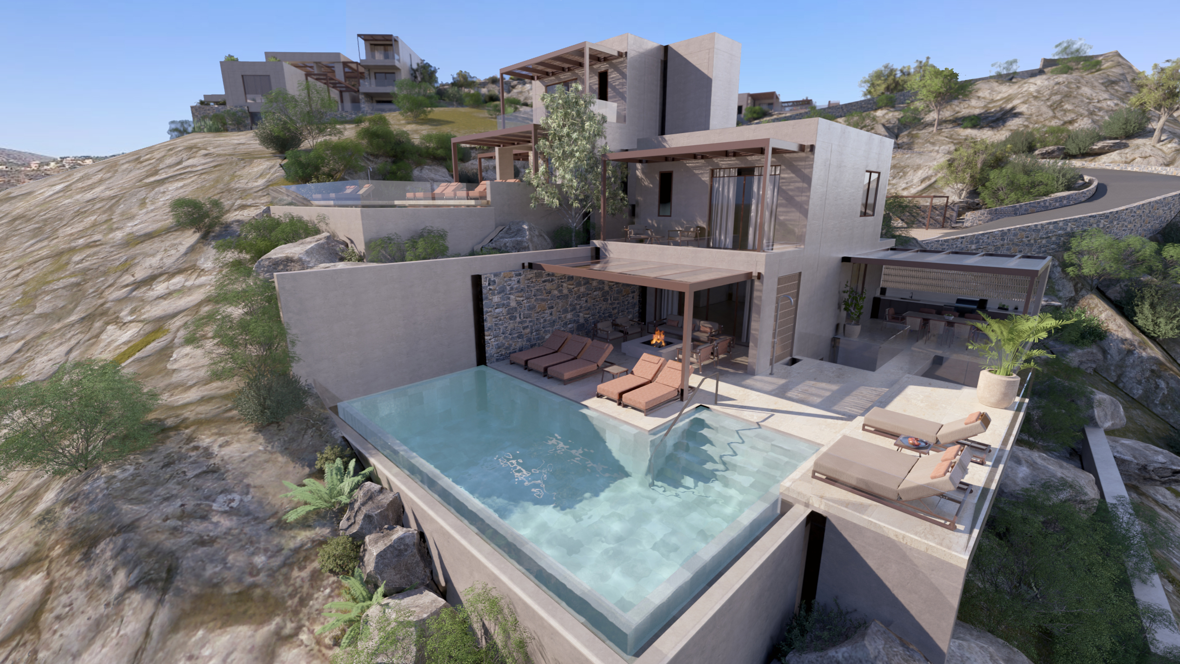 hyper realistic rendering of a villa exterior on a mountain next to the aegean sea with a perfect swimming pool overhanging golden hour