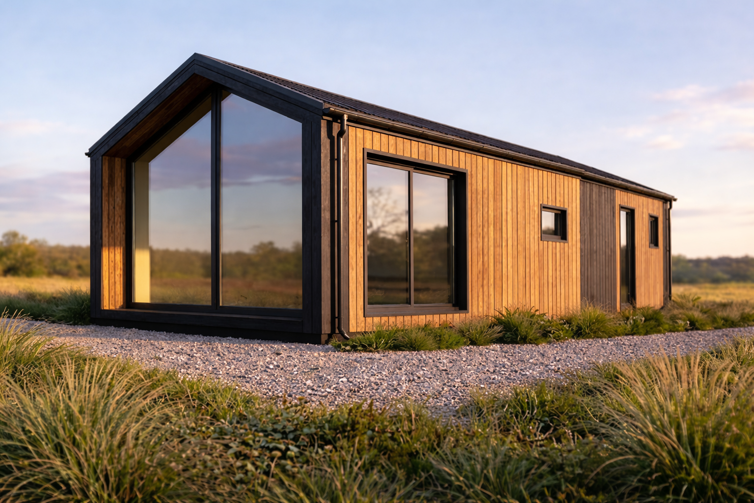 photorealistic modern tiny house in a natural grassy landscape vertical wooden cladding with black metal frame gabled roof modify the geometry so that the side wall next to the large front glass gable facade is shortened by approximately 10 cm so it no longer protrudes beyond the plane of the front glass the front glass facade remains flush and dominant maintain correct architectural proportions and clean alignment preserve all materials lighting and environment warm evening light soft shadows ultra realistic materials high detail 4k architectural visualization wide angle lens