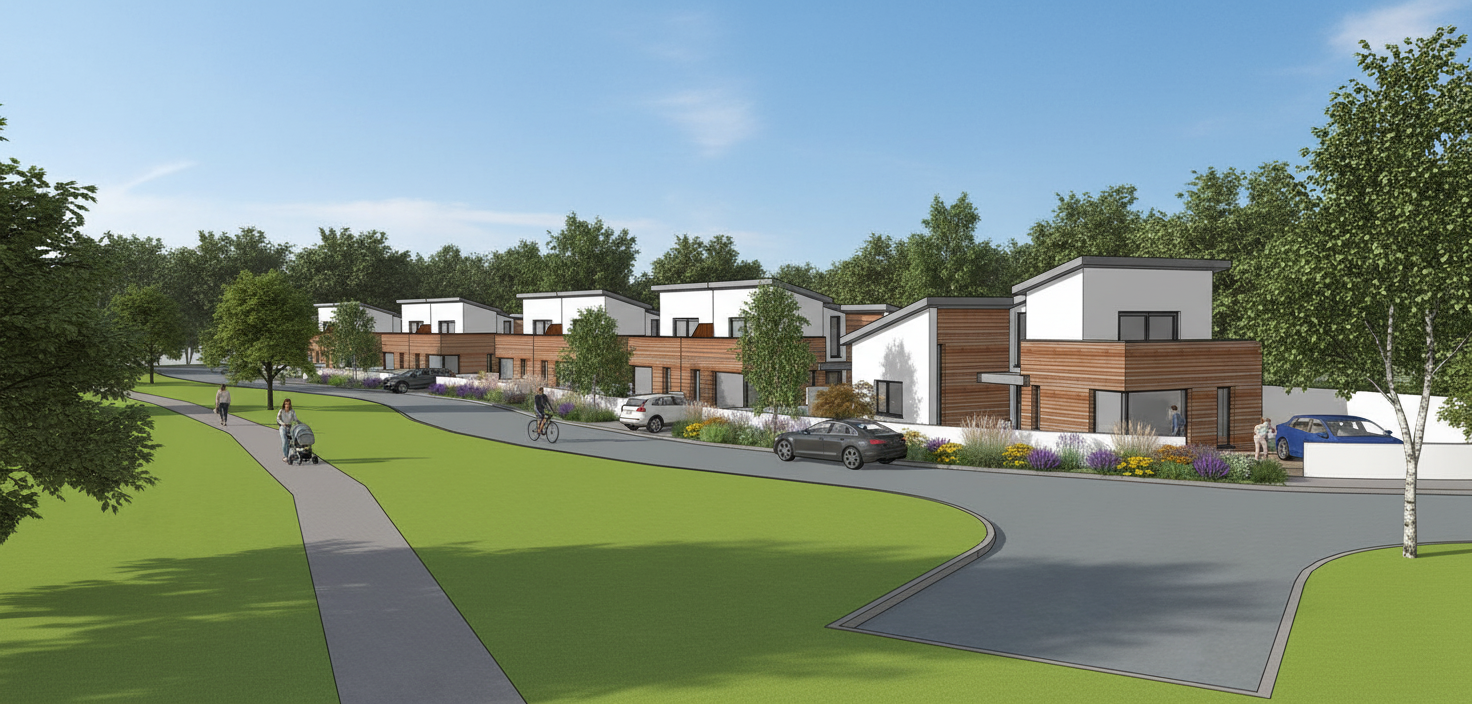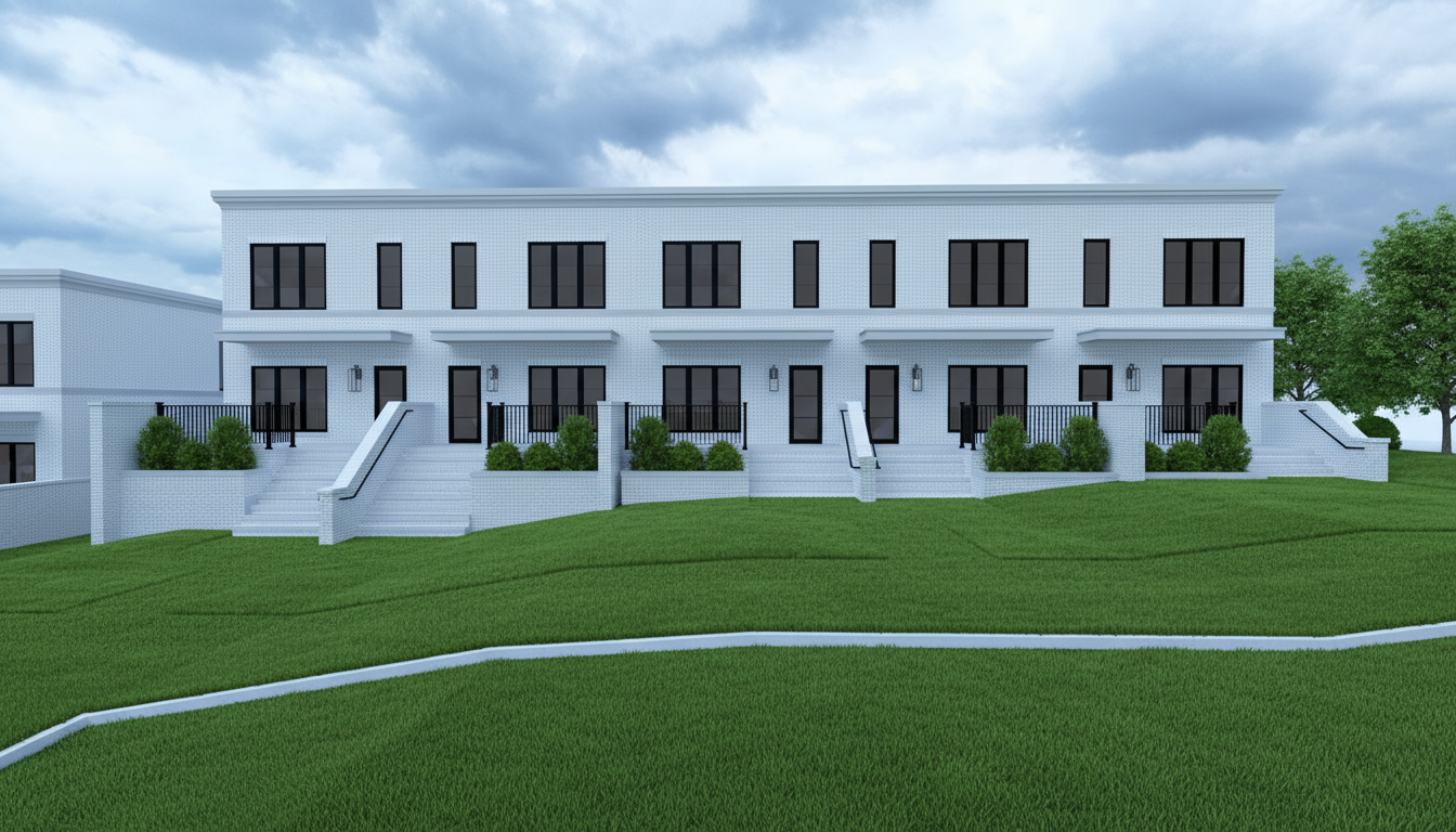 a modern 3 story coastal style home on a raised foundation siding in a light gray mist tone white trim and white framed windows add crisp contrast throughout the roof design uses a very dark gray to black shingle finish for a bold accent the house rests on a wide concrete slab with simple steps minimal landscaping of grass and small shrubs and a clean coastal streetscape background proportions and window placement should stay consistent with the reference render with a cohesive uniform style on all elevations