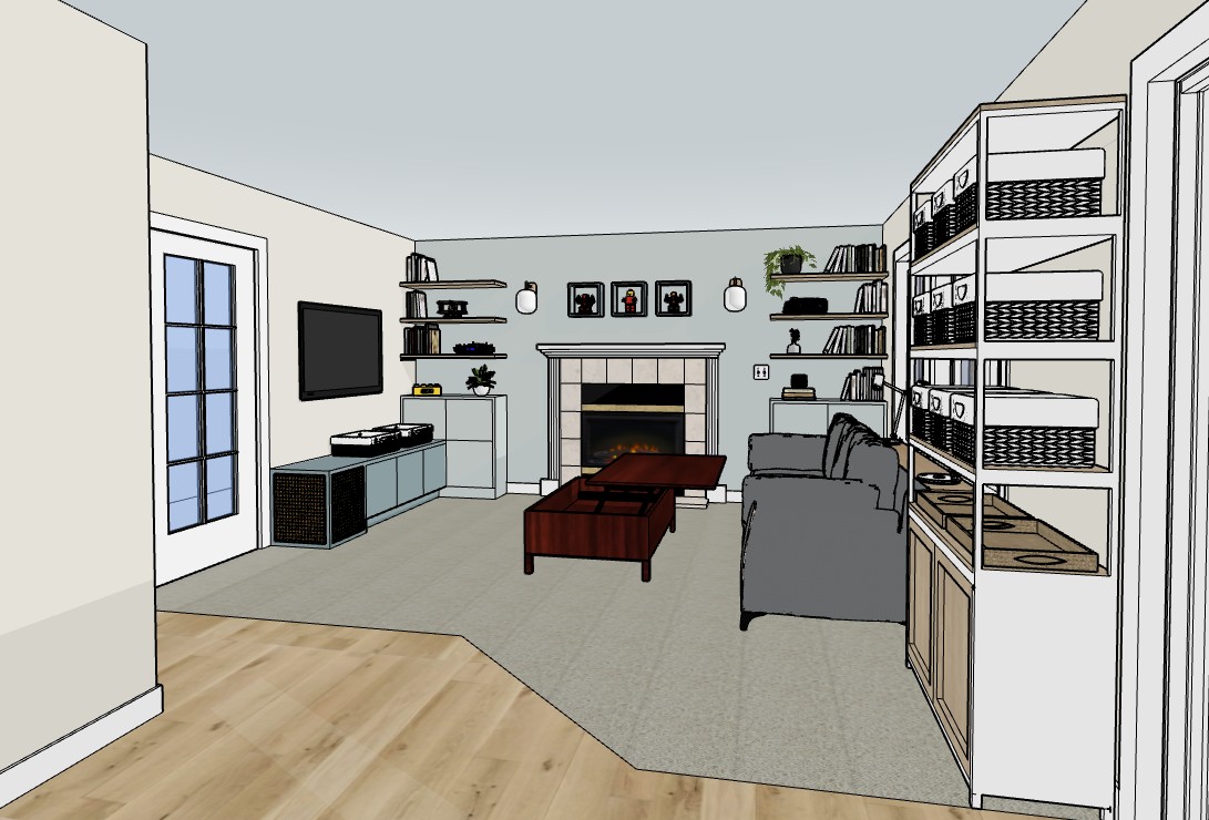 a cozy modern living room with a sleek design walls are a soothing light beige paired with pastel blue accent wall and shelving the fireplace is a central feature with a stone facade emitting a warm inviting glow shelves are filled with lego figurines and children s art in bright tones the furniture includes a plush grey sofa and a rich mahogany coffee table the floor is a warm wood finish complementing the overall ambiance soft lighting for a calm relaxing atmosphere