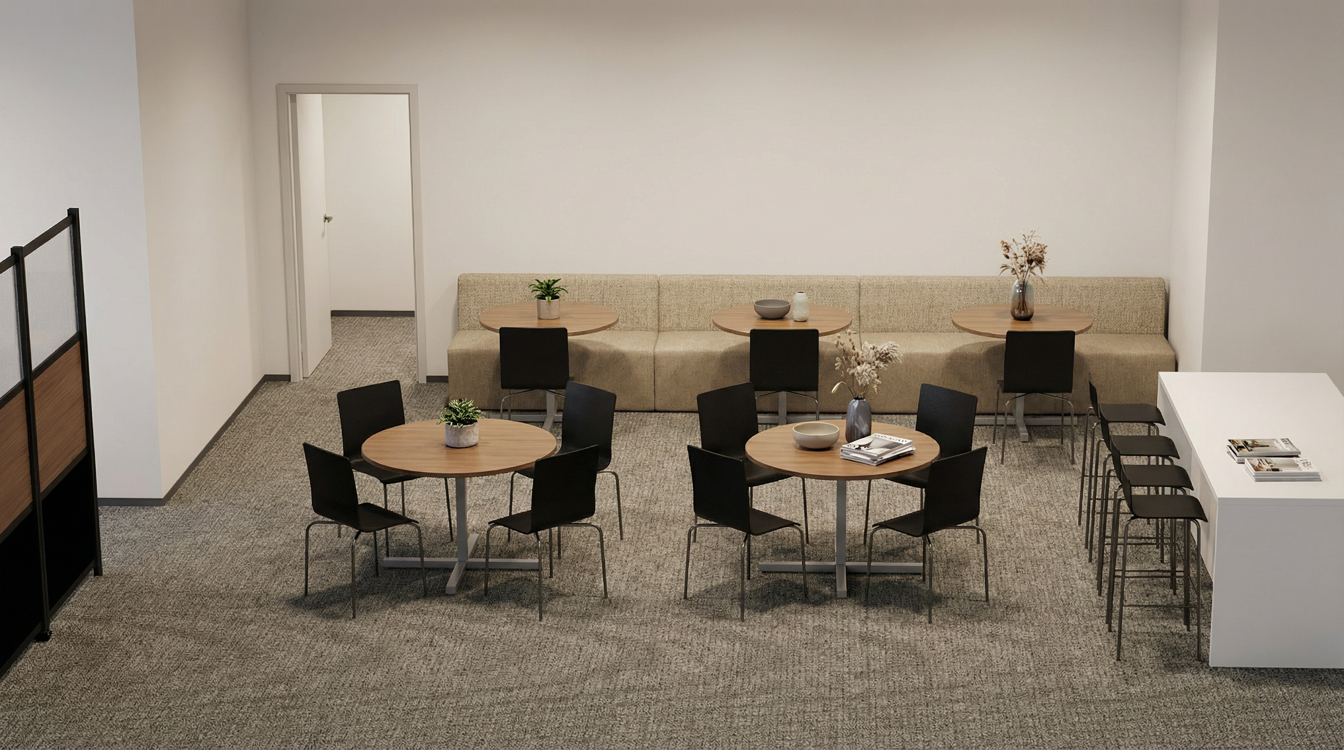 interior shot render a sleek and modern car rental office interior feature vibrant orange counters with black tops creating a striking and contemporary design display a stylish gray car poster on the wall with a focus on the sleek vehicle lines include ergonomic dark gray mesh office chairs for a professional atmosphere set the overall ambiance with soft ambient lighting to enhance the contrast and highlight the vibrant colors ensuring a welcoming yet sophisticated environment