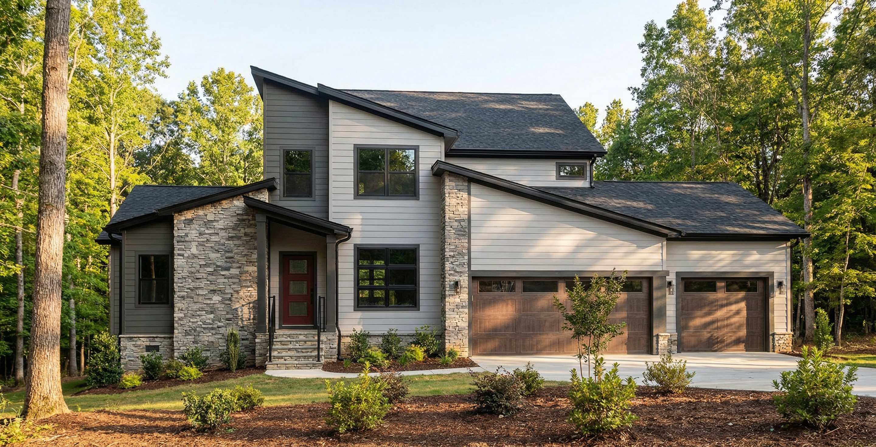 make a straight on front elevation photorealistic as possible while keeping textures the same as shown lightly landscaped in a lightly wooded suburb of north carolina nice lighting remove any text use the following finishes bfbdc3 7 lap siding where shown 4f524f 4 lap siding where shown black windows steinhause stack ledge stone black certainteed dimensional shingles with black soffit fascia and gutters 8b3636 three panel front door 2d2c2e posts