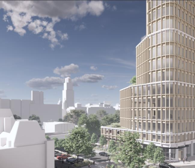 make it photorealistic add office interior desks people and activity and hot air balloon in the sky remove computers from the lefts these are rooftops and be carful with people falling out of the windows