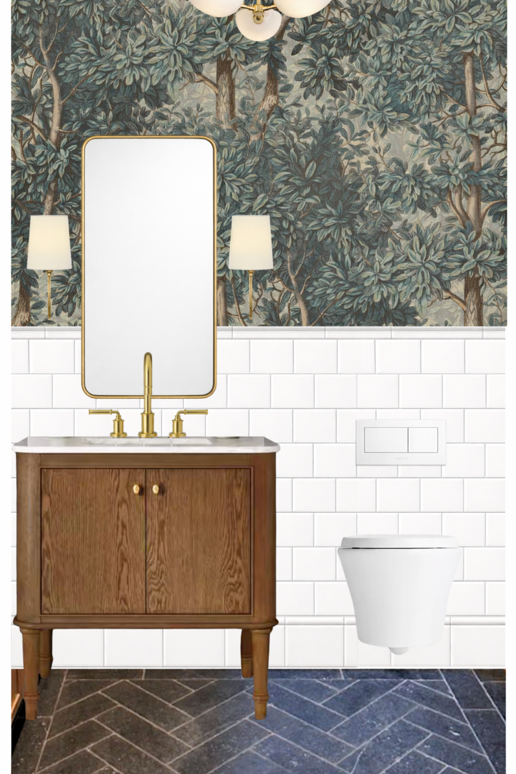 no natural light sophisticated bathroom with all unlacquered brass fixtures