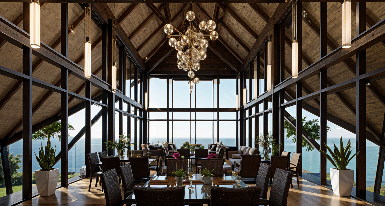 create a hyper realistic architectural render of the building shown in the reference image the design proportions and materials from the reference must remain exact with realistic textures applied glass concrete metal wood etc add people dining in the tables talking and eating