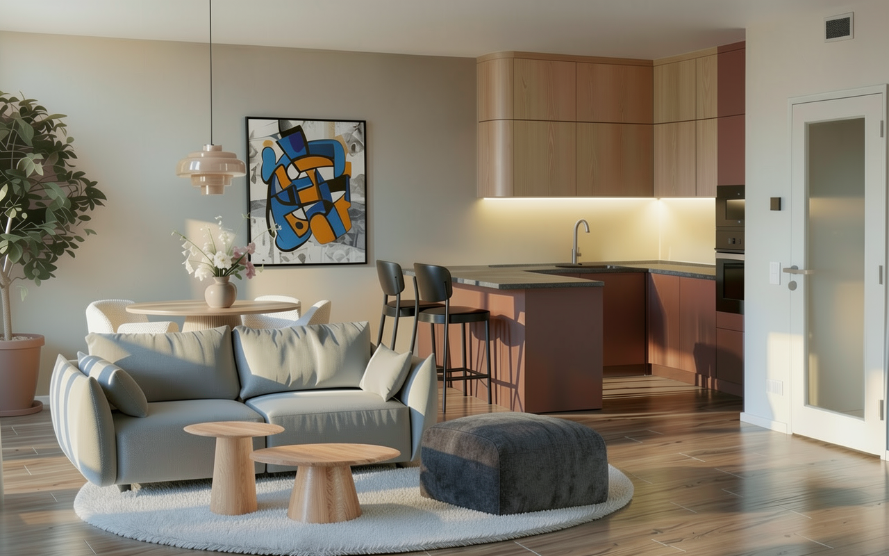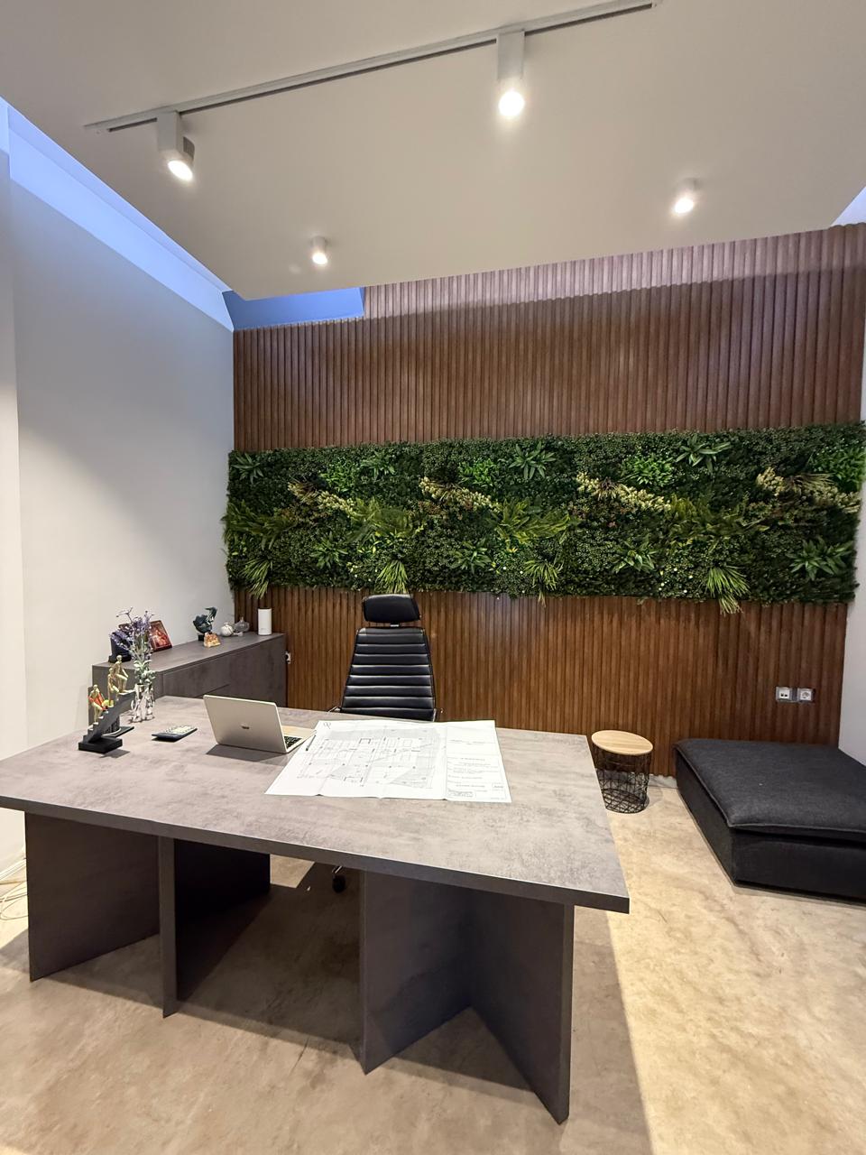 take the provided empty office image and do not modify anything in the space keep the exact walls floor ceiling lighting perspective and dimensions unchanged insert only one object add the exact same desk shown in the reference image asymmetrical executive desk warm wood top surface one dark marble stone block support on one side one darker vertical panel support on the other side clean modern architectural design placement position the desk parallel to the large window place it on the right side of the room maintain realistic scale and proportions ensure correct perspective alignment with the room important do not add chairs do not add decoration do not change lighting do not modify materials or colors in the room do not redesign anything the result should look like the desk was physically placed in the original photo