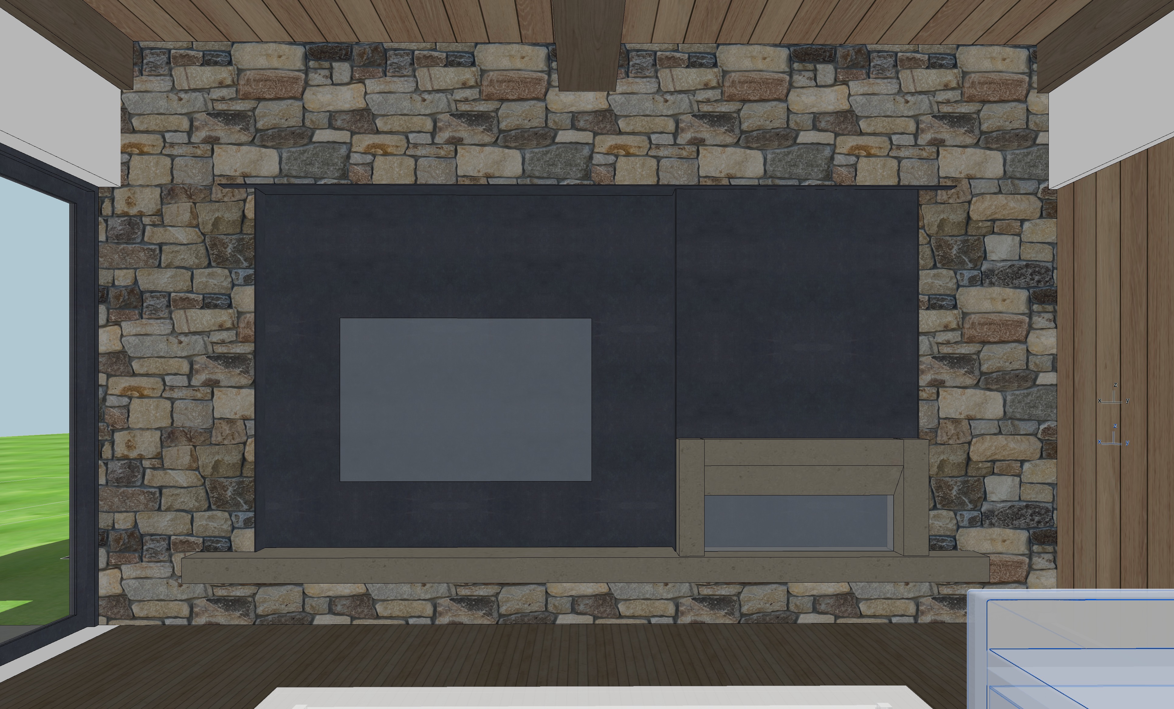 white oak coffee table fabric couch fireplace with fire surrounded by concrete mantle and fireplace surround blackened steel tv niche even mid day lighting sheetrock walls